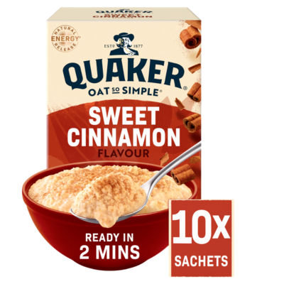 Product Information- Great Taste Award Winner 2023! - 10 delicious Quaker Oat So Simple sachets with 100% wholegrain Quaker rolled oats - For over 140 years, the humble oat has inspired Quaker to make delicious porridge, cereal, granola and more - The creamy goodness of 100% British wholegrain oats, combined with the deliciously warming flavour of sweet cinnamon - guaranteed to get your mouth watering. - Perfect porridge in just 2 minutes, Quaker Oat So Simple microwaveable oats are a great morning time-saver - In a rush? Slip a sachet into your bag and enjoy at the office. Simple. - Only natural flavours and no artificial preservatives - Sustainably grown british oats - Helps lower cholesterol through each serving (33g) containing 33% of the 3g of oat beta-glucan suggested per day. - Outer packaging is recyclable † Oats are high in manganese, which contributes to normal energy-yielding metabolism. Enjoy as part of a varied and balanced diet and healthy lifestyle.