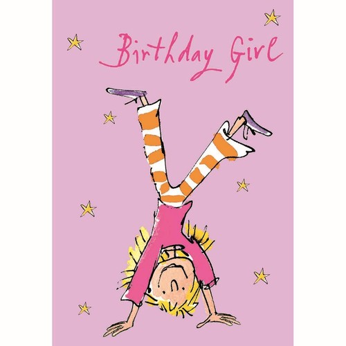 This Woodmansterne greeting card features a delightful illustration perfect for celebrating a special birthday. The front design showcases a whimsical depiction of a girl doing a handstand, clearly marking it for a "Birthday Girl." Inside, the card provides a straightforward message reading "Happy Birthday" for easy sending.