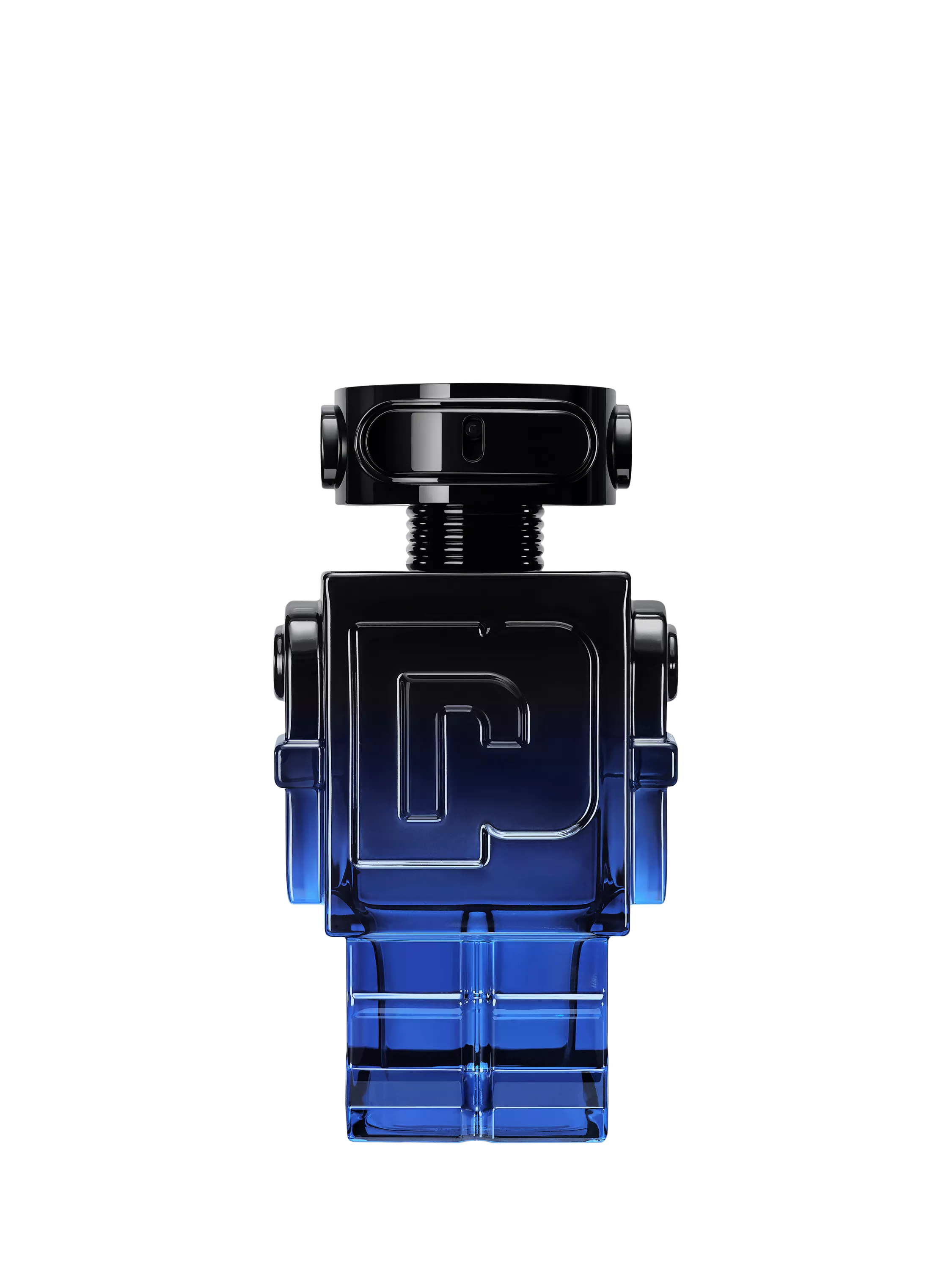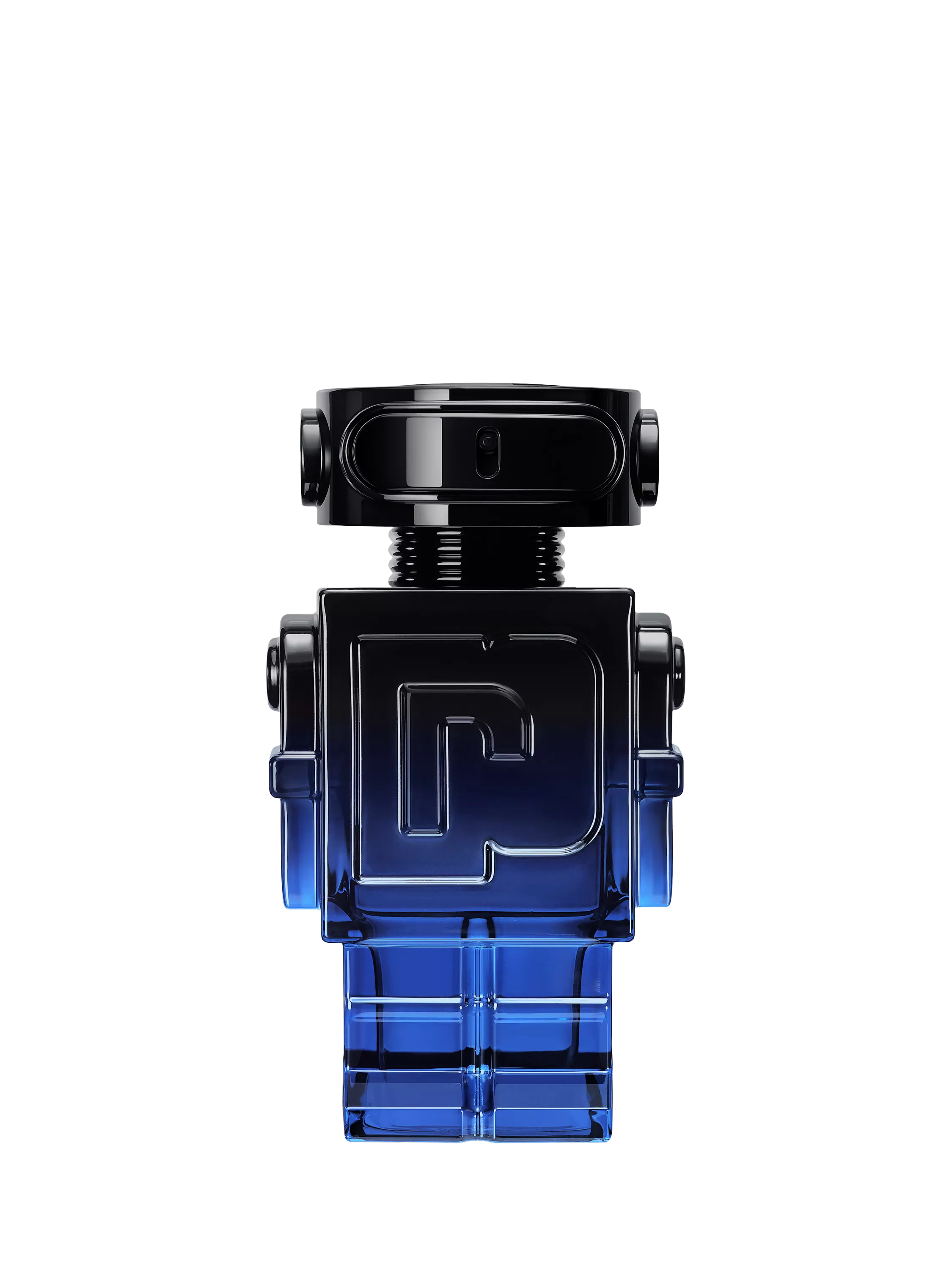 Capturing the enigmatic spirit of the Phantom, the iconic robot transforms from fully mat black to a gradient of blues that fade, like Paris at twilight, to a powerfully masculine lacquered finish. The glossy jet–black spray cap meets the high–shine electric blue bottle to defy expectations as a daring new icon is born.