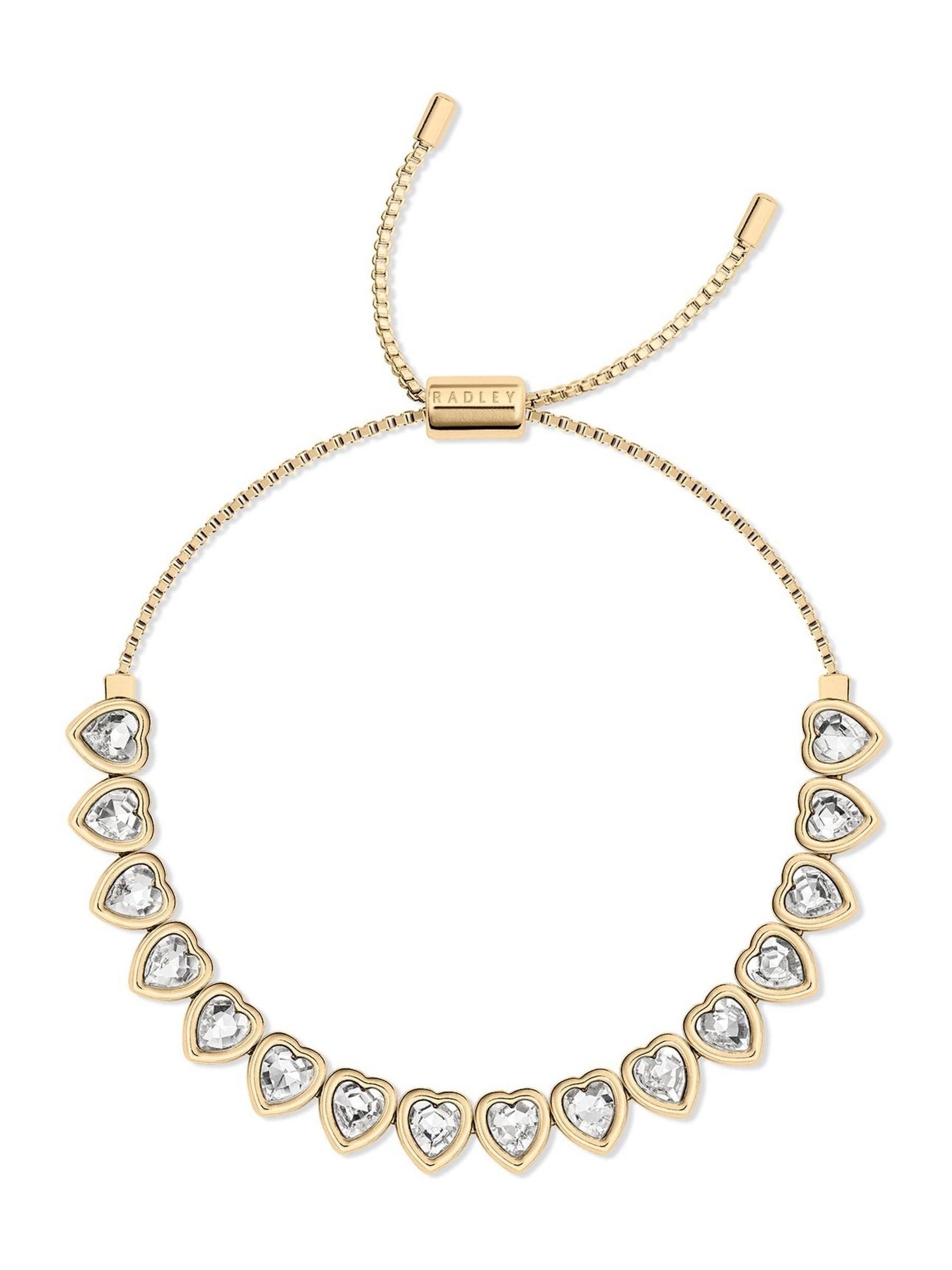 Radley 18ct Pale Gold Plated Heart Stone Set Bracelet. With a friendship style construction, this 18ct gold plated bracelet features clear stones set into gold heart shaped casing.