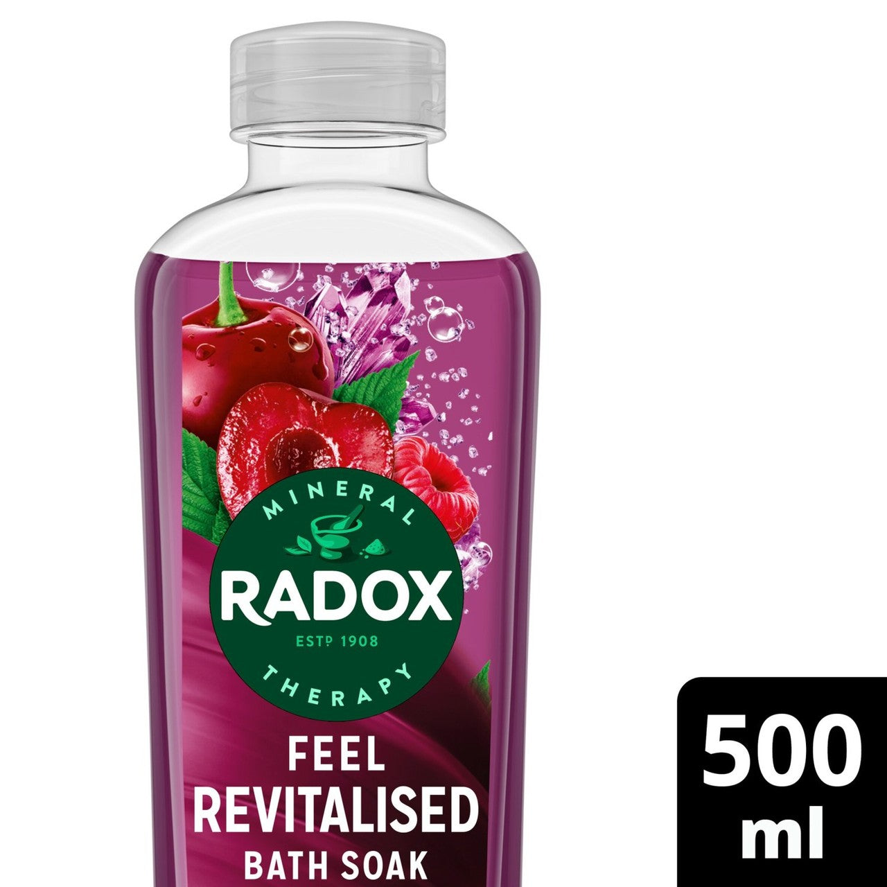 Let the Radox Mineral Therapy Feel Revitalised Bath Soak boost your mood during your bath ritual. This soak features an invigorating wild cherry and raspberry scent designed to cleanse and revive the senses. It combines essential minerals with a proprietary blend of herbs activated by hot water for a soothing experience.