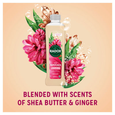 Product InformationEnjoy the soothing blend of shea butter and ginger with RADOX Feel Pampered Bath Soak. From troubles to bubbles, close your eyes and let the uplifting bath soak cleanse your body and revive you. RADOX Feel Pampered Bath Soak is enriched with 4 minerals and RADOX's unique blend of 13 herbs that helps you indulge in a relaxing bath therapy ritual. Our blends, uniquely created with minerals and herbs, activate with hot water to cleanse and revive you in a recharging bubble bath. For best results, pour bath gel under running water and relax. For lots of bubbles, pour a generous amount of RADOX Feel Pampered bath soak into an empty bath, and run the tap over the top whilst stirring with your hand. Avoid contact with eyes. If eye contact occurs, rinse well with warm water. If rash or irritation occurs, discontinue use. From as early as 1908, RADOX founders used a unique blend of minerals and herbs to ease the fatigue of weary bodies and minds. From reviving the tired feet of early travellers to helping hardworking people find a moment of solitude and sanctuary – RADOX bath soaks and bath salts are rooted in the transformative power of mineral therapy. We have a long history of everyday therapy, we call it your daily R&R, RADOX Mineral Therapy. Enjoy our Feel Pampered Bath Soak.