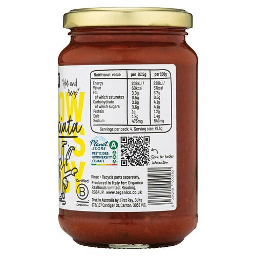 Realfoods by Organico offers this traditional Italian Arrabbiata sauce, expertly made with organically sourced ingredients. This rich sauce is enhanced with chilli for a satisfying warmth and uses extra virgin olive oil. It is specifically selected to elevate your pasta dishes easily and deliciously.