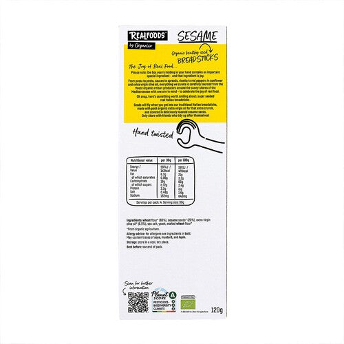 Organic crunchy hand-finished real Italian breadsticks with extra virgin olive oil to give them that extra crunch and covered in deliciously toasted sesame seeds.