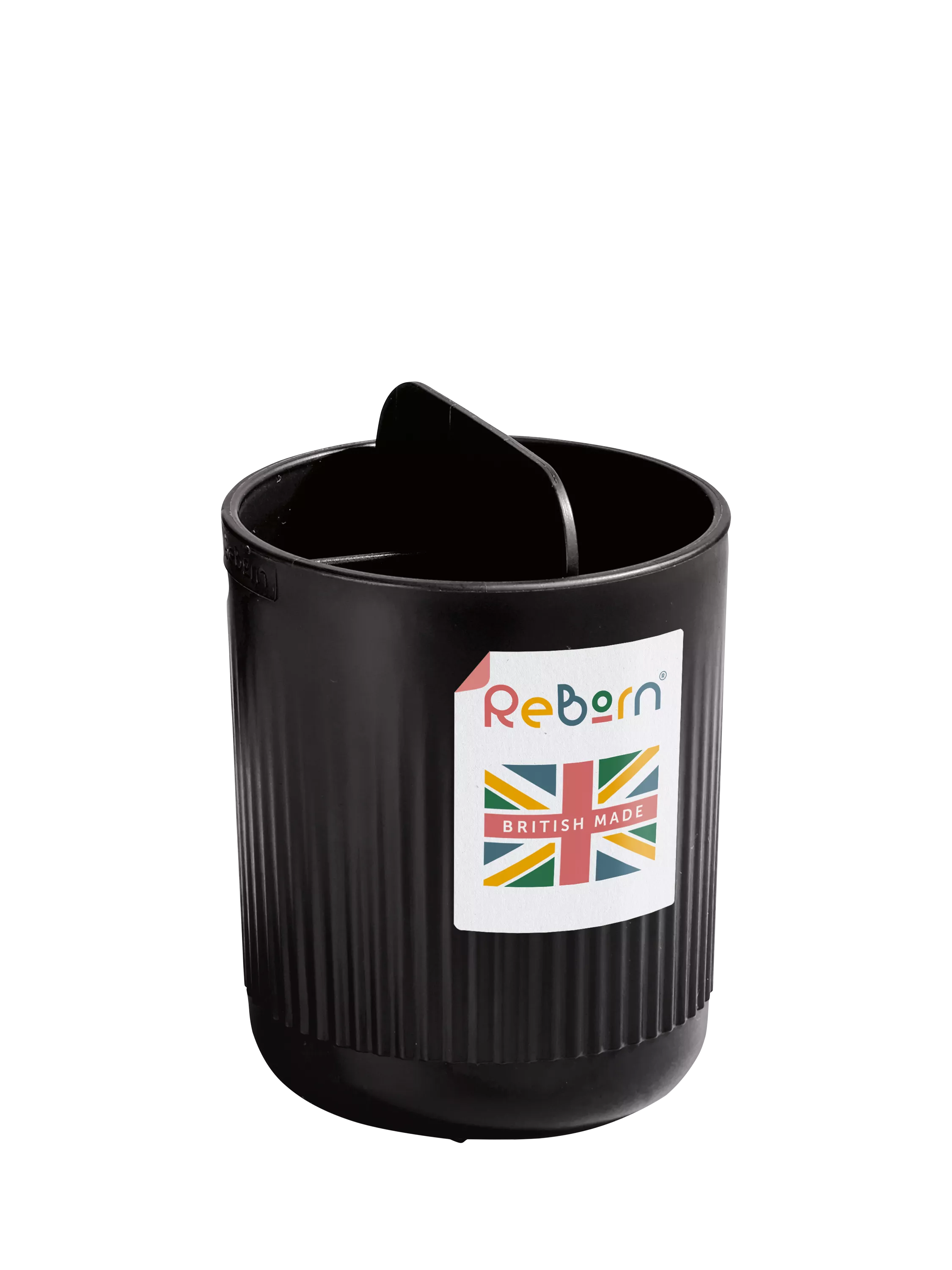 This toothbrush holder is made from recycled materials and features three compartments - two small, one large - and a raised level insert with holes for drainage.