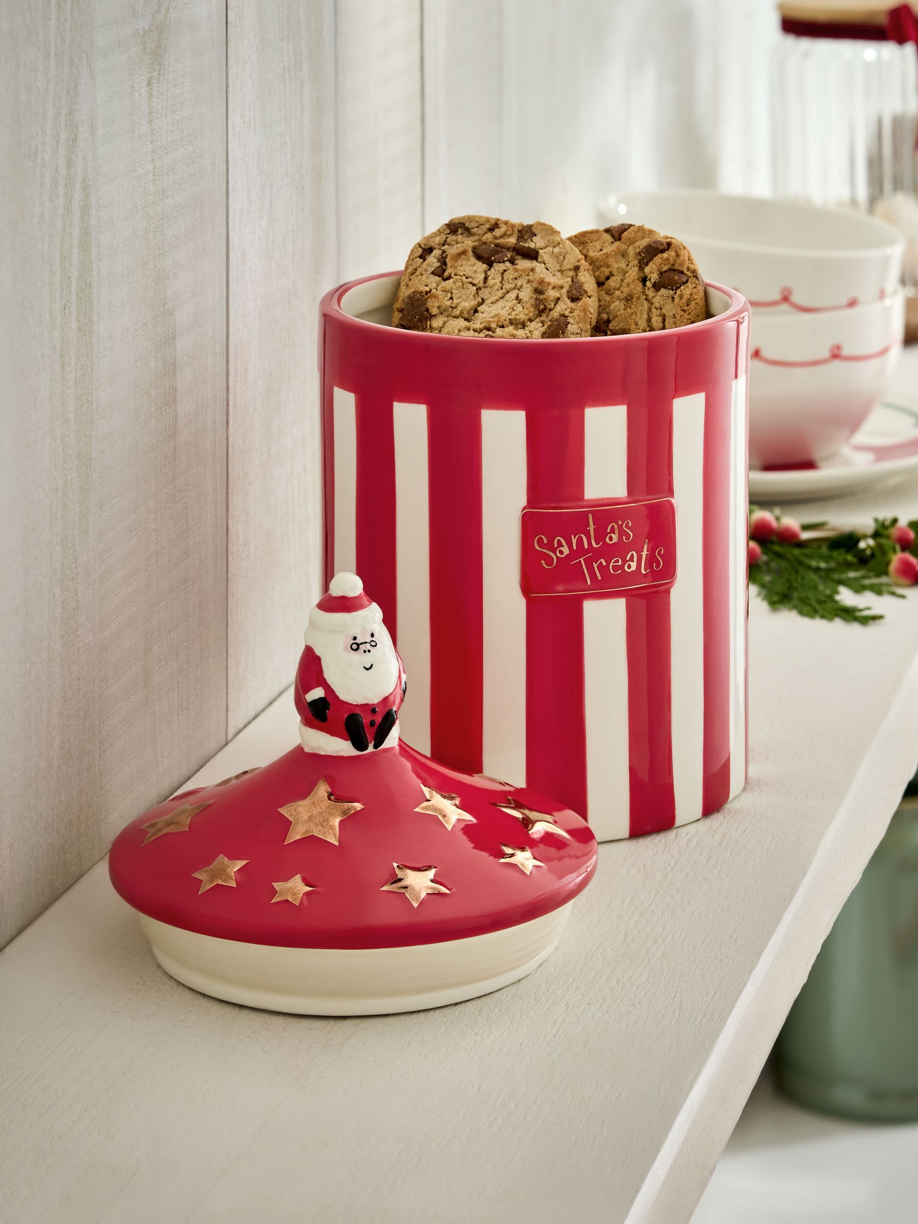 Store your holiday goodies in this festive red and white striped ceramic jar. Featuring gold stars and a Santa Claus topper, it's the perfect way to keep your Christmas treats fresh.