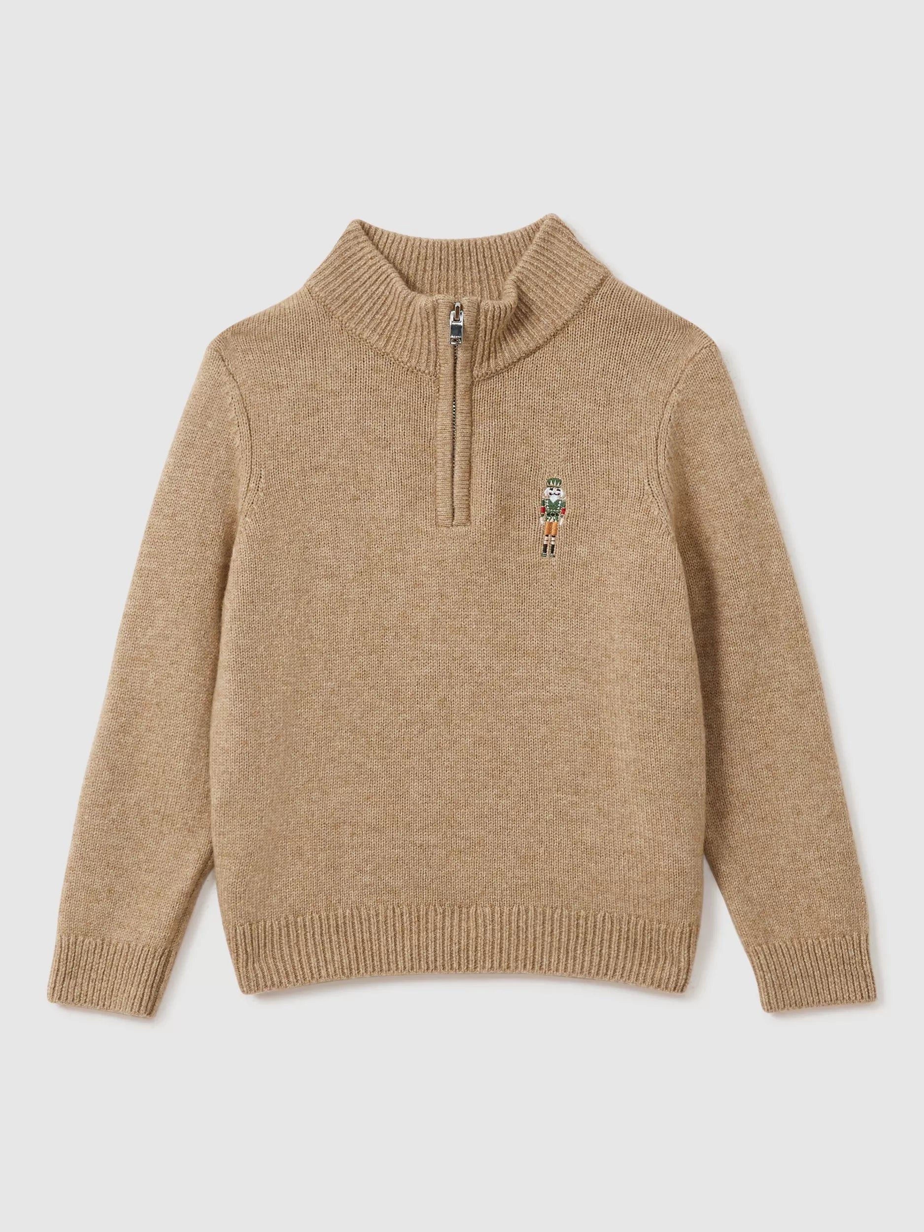 With nutcracker embroidery to the chest, this half zip jumper by Reiss is crafted from a warm woollen blend to keep out the chill.
