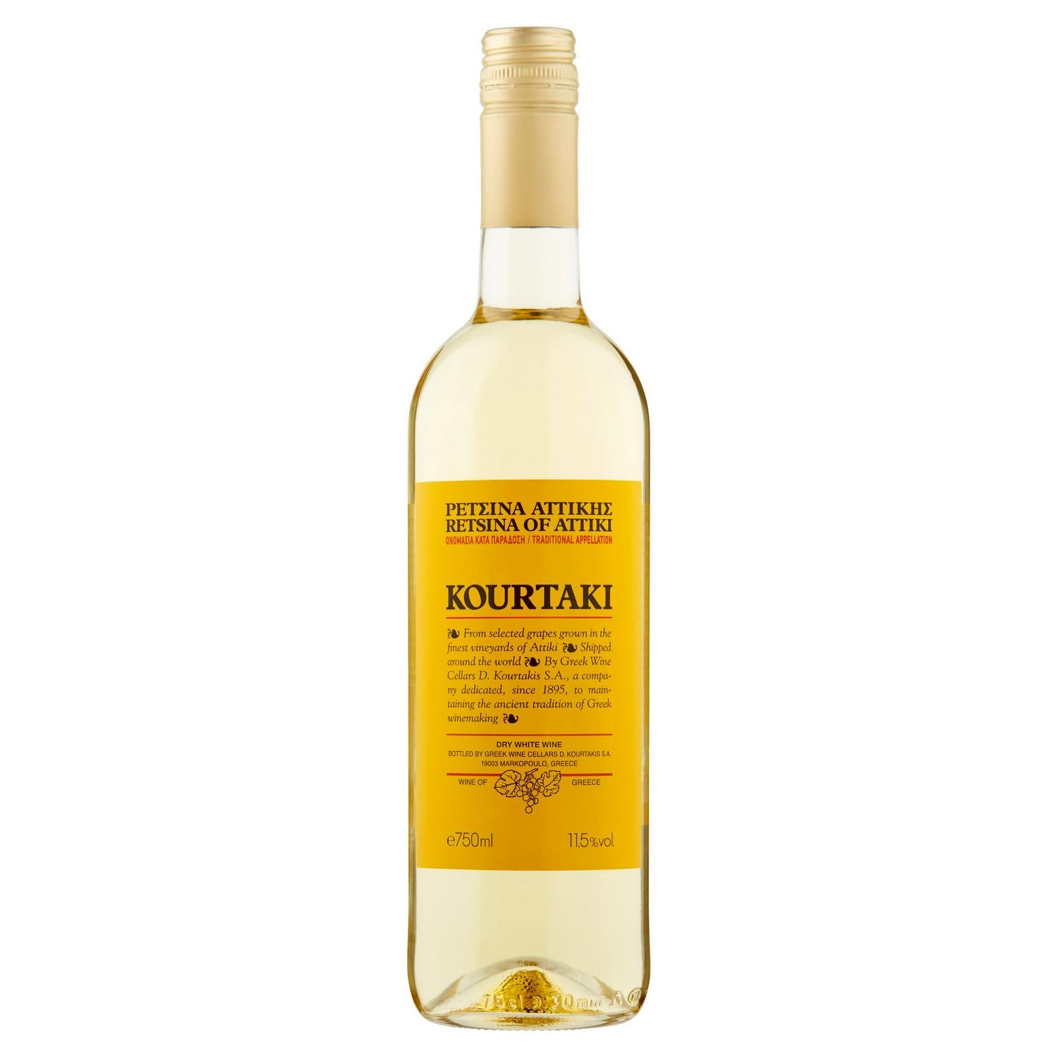 This Kourtaki Retsina of Attiki is a dry white wine rooted in ancient Greek tradition. It features the distinctive flavour imparted by resin added during the fermentation process. Sourced from selected grapes grown in the finest vineyards across Attiki, this wine maintains a classic profile.