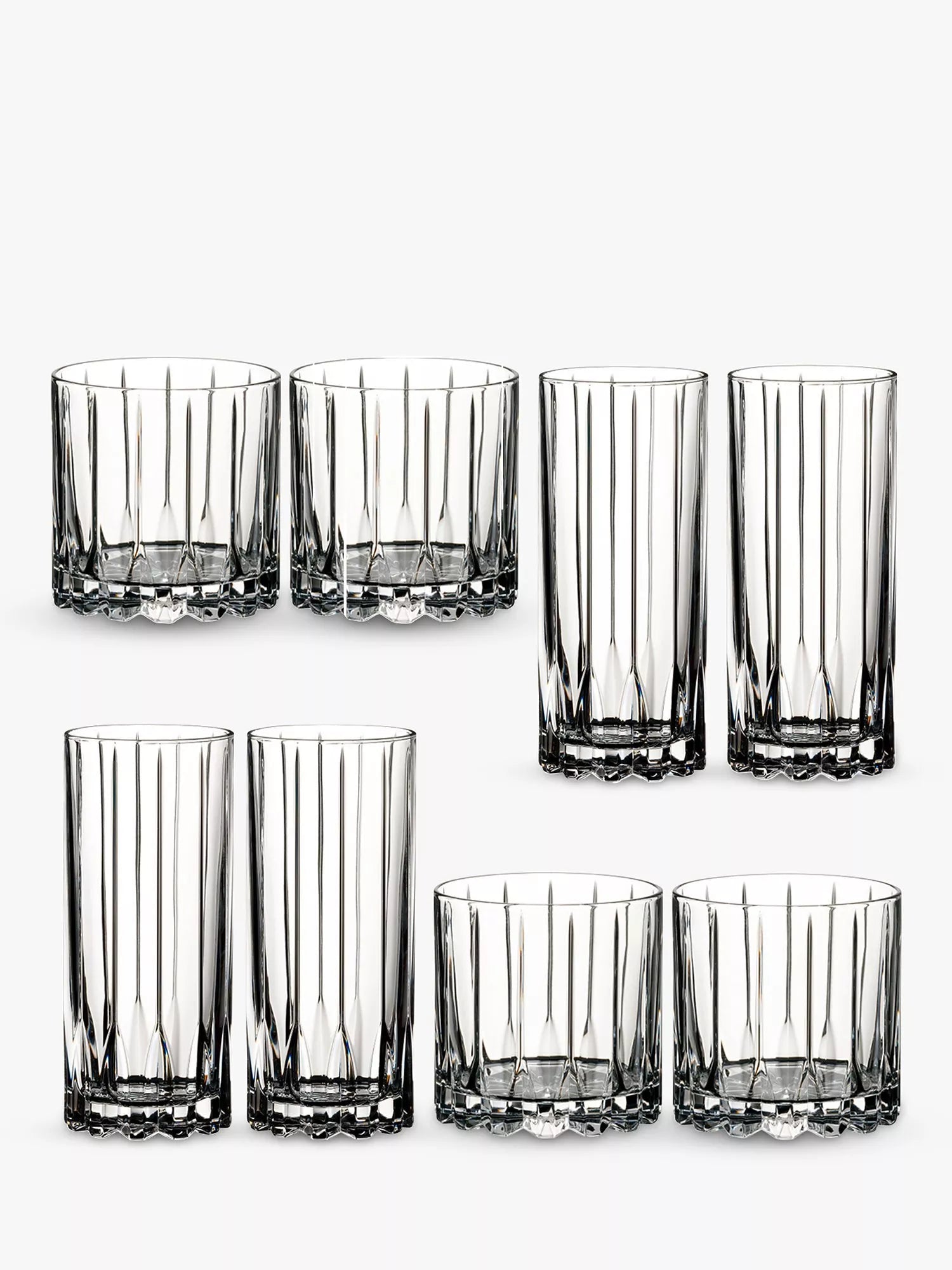 An eight-piece glassware set from RIEDEL Bar's Drink Specific Glassware collection. This special set comprises four Rocks tumbler glasses and four Highball glasses. The glasses are dishwasher safe for easy and hygienic cleaning.
