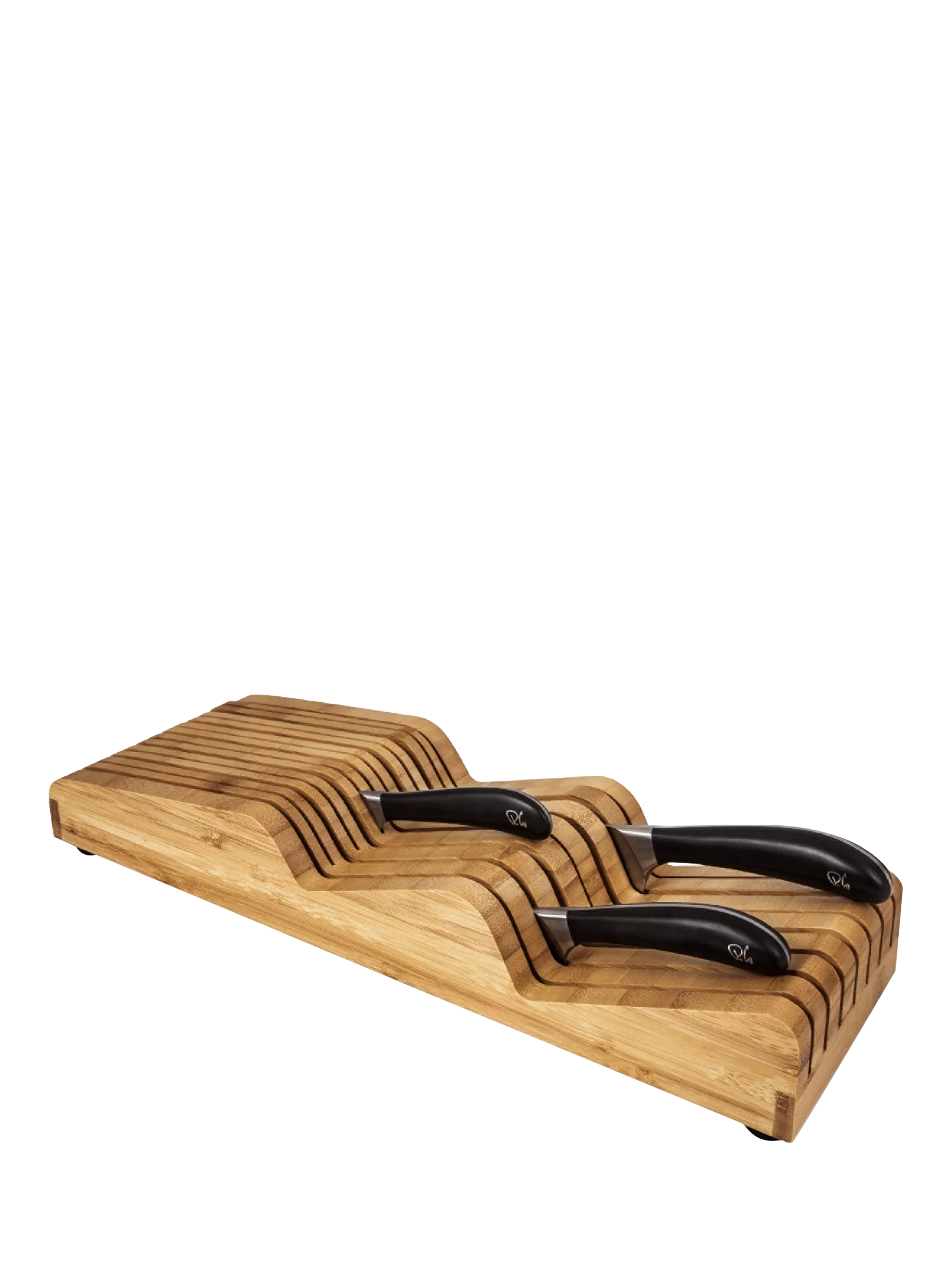 It fits standard-sized kitchen drawers, but shallower drawers may not close fully if you are trying to store larger knives. The multi-award-winning Robert Welch Designs Signature kitchen knife collection was developed with professional chefs and is designed for purpose and practicality in everyday food preparations. The bamboo drawer unit is designed to house up to 13 knives.