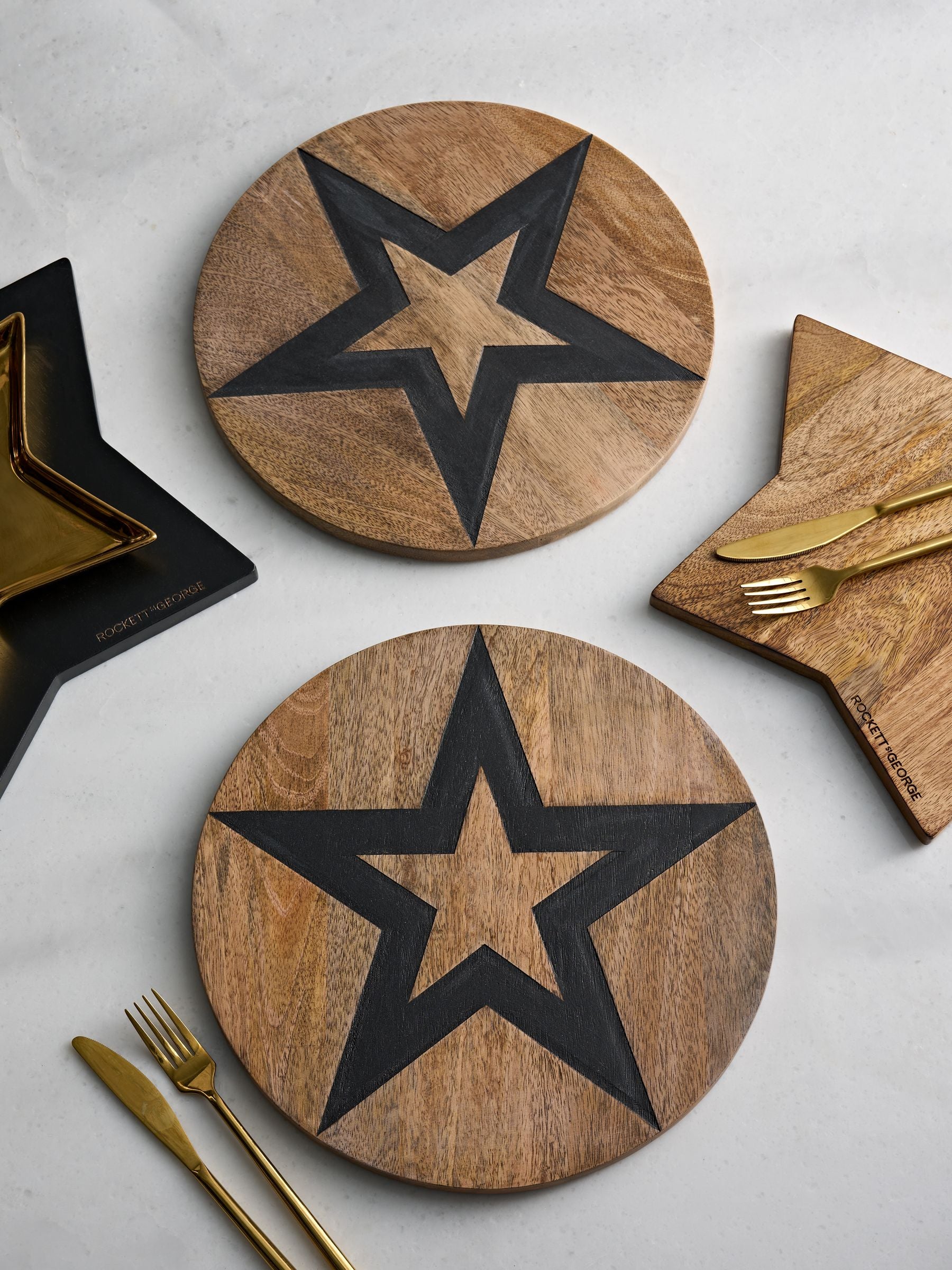 Serve is star style with the Set of 2 Wood Studio Star Placemats from Rockett St George. Crafted from solid wood, these circular placemats are embossed with a showstopping star design. A fun and effortless way to amp up your tablescape, why not pair with the matching coasters for a complete look.