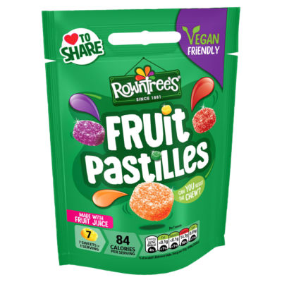 Product InformationIf you're looking for a chewy, fruity-flavoured sweet, try the irresistible taste of Rowntree's® Fruit Pastilles. Every sharing bag contains a mixture of five fantastic flavours: blackcurrant, lemon, strawberry, lime, and orange. Still irresistibly chewy and now vegan friendly for even more people to enjoy! We're confident that it's our best ever tasting recipe! These classic sweets are a great choice for treat time. And with no artificial colours, flavours or preservatives, you can feel happy to enjoy these as a fun treat. Did you know that Fruit Pastilles are the oldest sweet in the Rowntree's® family? In 1862, Henry Rowntree bought a cocoa works in York and transformed it into a confectionery company. Along with his brother, Joseph, and French confectioner August Claude Gaget, they developed the delicious taste of Rowntree's® in 1881. For more than 130 years these delicious chewy sweets have been making days more colourful with their irresistibly fruity taste and mouth-watering texture.