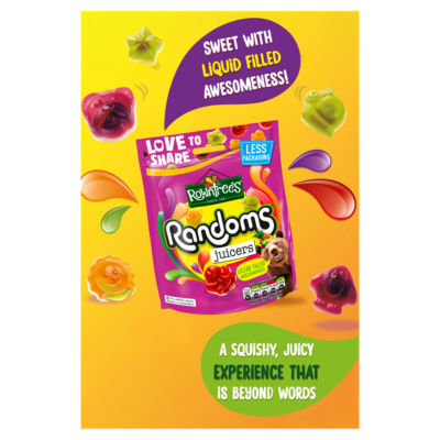 Product InformationLiquid Filled Awesomeness! A squishy, juicy experience that is beyond words! Give a big thumbs up to Rowntree's® Randoms® Juicers, soft and chewy sweets with a liquid centre, bursting with yummy juiciness - You'll love each one. Did you know that we don't use artificial colours, flavours or preservatives in Rowntree's® sweets? It's even more reason to enjoy the different flavours, textures, shapes, and colours in every playfully random bag. These brilliantly random sweets are brought to you by Rowntree's®, the makers of the classic Fruit Pastille. The story begins in 1862, when Henry Rowntree bought a cocoa works in York and transformed it into a confectionery company. In 2009 Randoms® were born, bringing fruity randomness to the family.