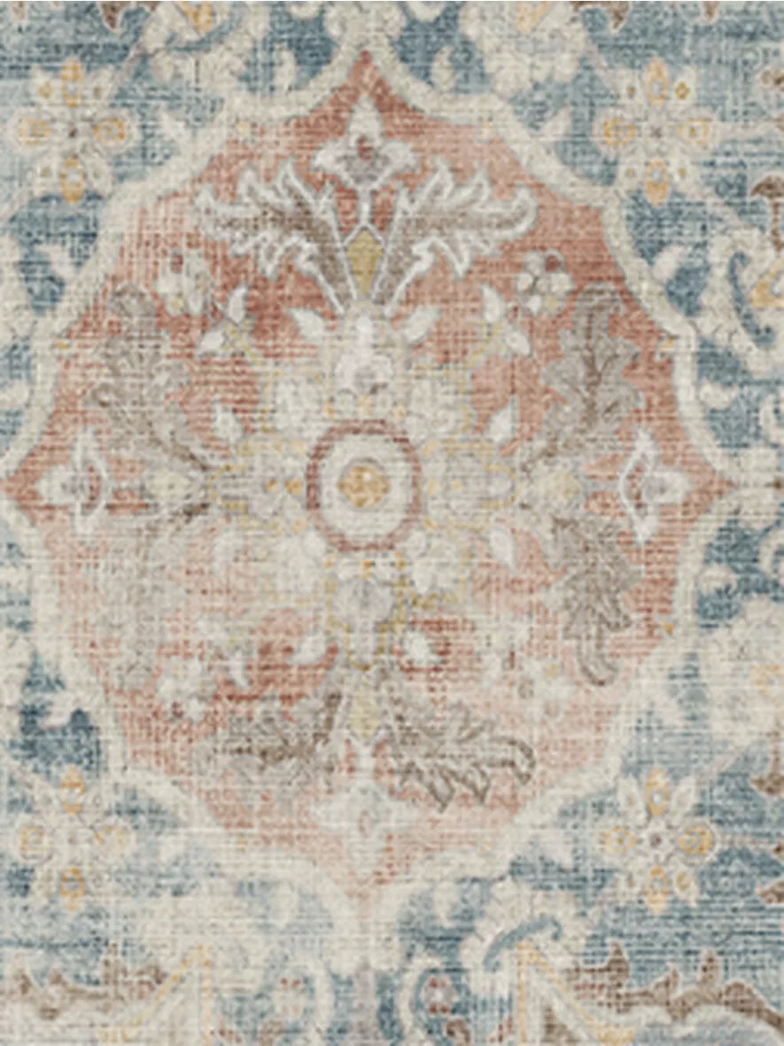 Warm and rustic. Beautiful shades blend together in this rug to create a beautifully rich, distressed design featuring a floral medallion and border. Water-resistant, stain-resistant, and machine-washable.