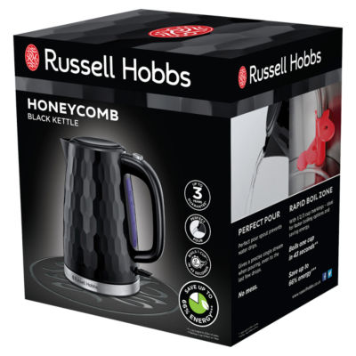 Fancy a cup of tea from a kettle you're proud to have on your kitchen countertop? Then you will love the on-trend Honeycomb Kettle in Black. Bringing you a Premium Design at a price you can afford, this kettle's Honeycomb-Inspired Design and Stainless Steel Accents will make a statement on your counter, without having to restyle your entire kitchen. Boiling you a cup in 43 Seconds, from a Perfect Pour Spout that prevents any splashes and spills – making a cuppa has never been easier. - 1.7l Capacity Plastic Textured Kettle - Stainless Steel Accents - Internal Rapid Boil 1/2/3 cup markers - Boils One Cup in 43 Seconds* - Saves up to 66% energy** - Water Window - Boil Dry Protection - Push Button Lid - Perfect Pour Spout - 360° Base with Cord Storage - 3000W