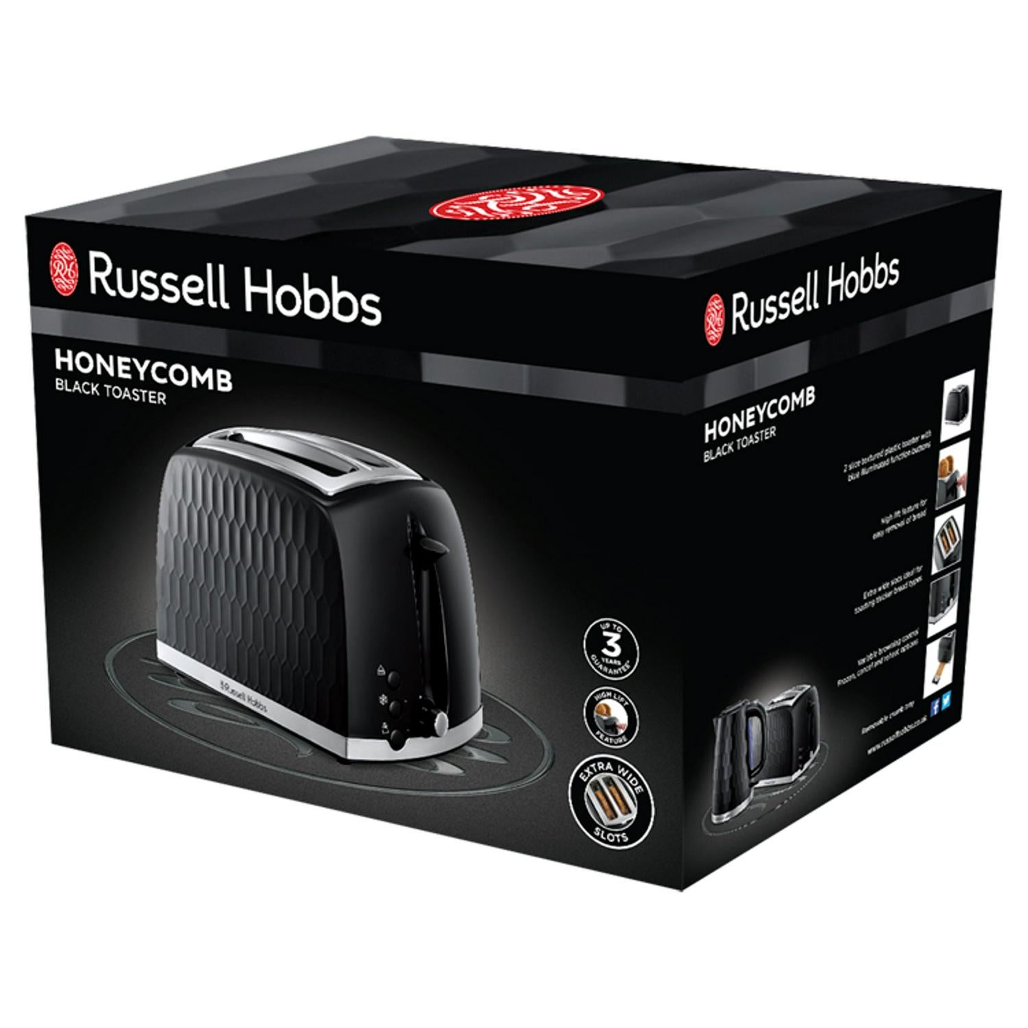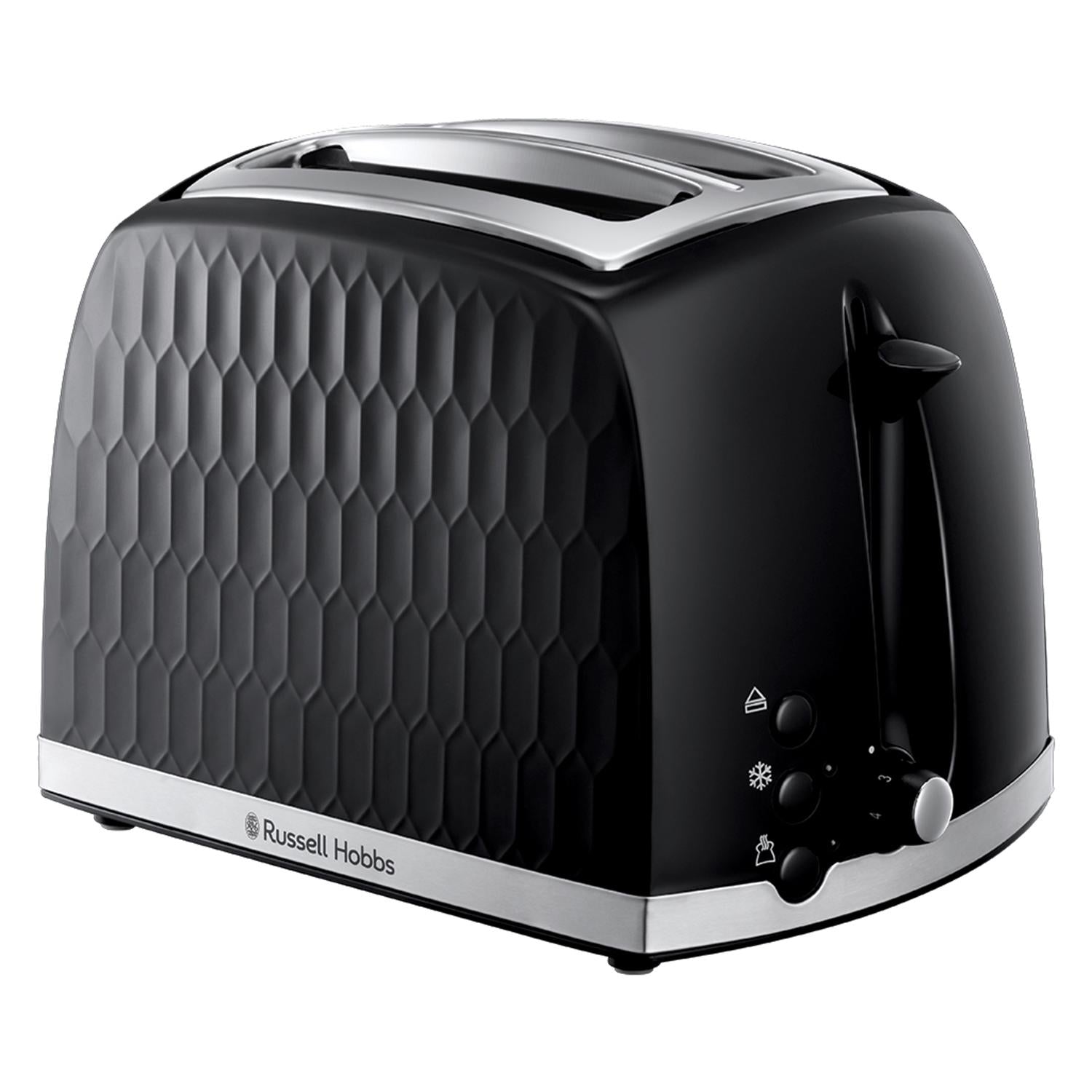 Read MoreKeep your kitchen on-trend with the Russell Hobbs Honeycomb 2 Slice Toaster in black with a textured design. Letting you give your kitchen a makeover without blowing your budget, this black toaster not only brings style to your countertop, but it also comes convenient features including high lift, extra wide slots, variable browning control and a removable crumb tray. You can enjoy a tasty slice of toast from a toaster you're proud of. What more do you need? Other than the matching kettle.