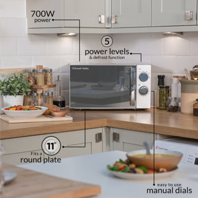 Read MoreDesigned with practicality in mind, this contemporary, 17L microwave brings a stylish look to your kitchen with a sleek mirror door finish and chrome controls. This microwave is the perfect everyday microwave, ideal for cooking a variety of meals in minutes. This attractive appliance is simple and easy to use. Offering 700 watts of microwave power with 5 power levels to choose from, cooking at home can be super quick and convenient. Plus, there’s plenty of space for a round dinner plate up to 10.5" (26.6cm). From microwaving to defrosting, this microwave has you covered. You can easily cook everything from vegetables to meat, fish and your favourite frozen meals straight from the freezer. The easy-to-use pull handle, controls and dial makes cooking your favourite meals simple. The 35-minute timer helps you to stay in control of your cooking, plus, the handy ringer function lets you know that your cooking cycle has finished. Cooking has never been so easy! For added peace of mind, this microwave comes with a 1 Year Guarantee. This way, in the unlikely event something goes wrong, you know we'll always be on hand to help. It is hazardous for anyone other than a competent person to carry out any service or repair operation that involves the removal of a cover which gives protection against exposure to microwave energy. Liquids and other foods must not be heated in sealed containers since they are liable to explode. The appliance and its accessible parts may become hot during use. Care should be taken to avoid touching heating elements. Do not leave the microwave oven unattended while you are using it. Do not use the microwave when it is empty. This could damage the oven. This appliance is intended to be used in the household and general domestic applications. It is not intended to be used in industrial or commercial applications. In-store availability, price