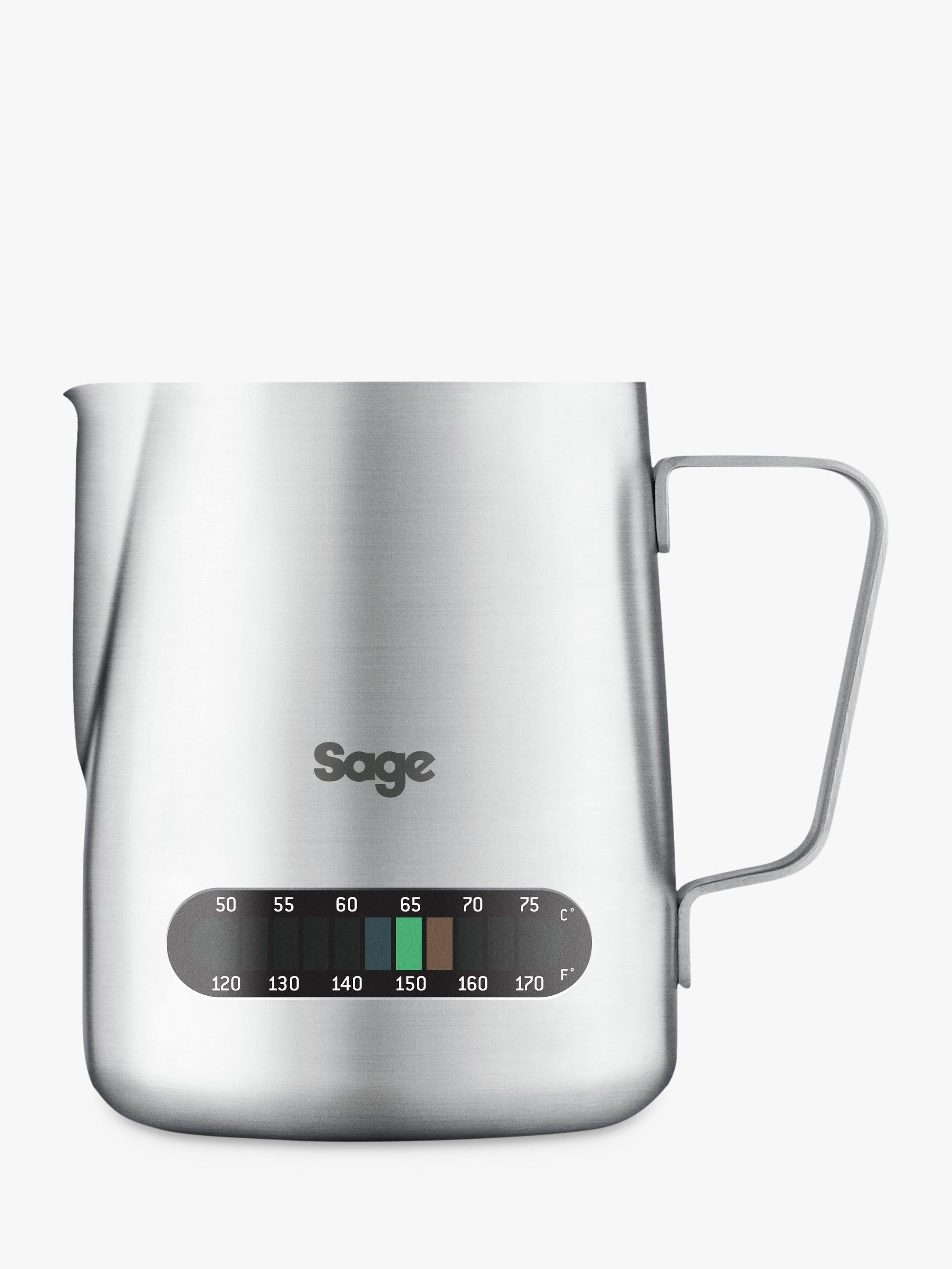 The Sage Temp Control Milk Jug assists in achieving ideal milk texture for premium coffee beverages when used correctly by you. It features an integrated thermometer indicator strip that ensures accurate temperature reading during the heating process for optimal frothing. This jug is designed for daily performance.