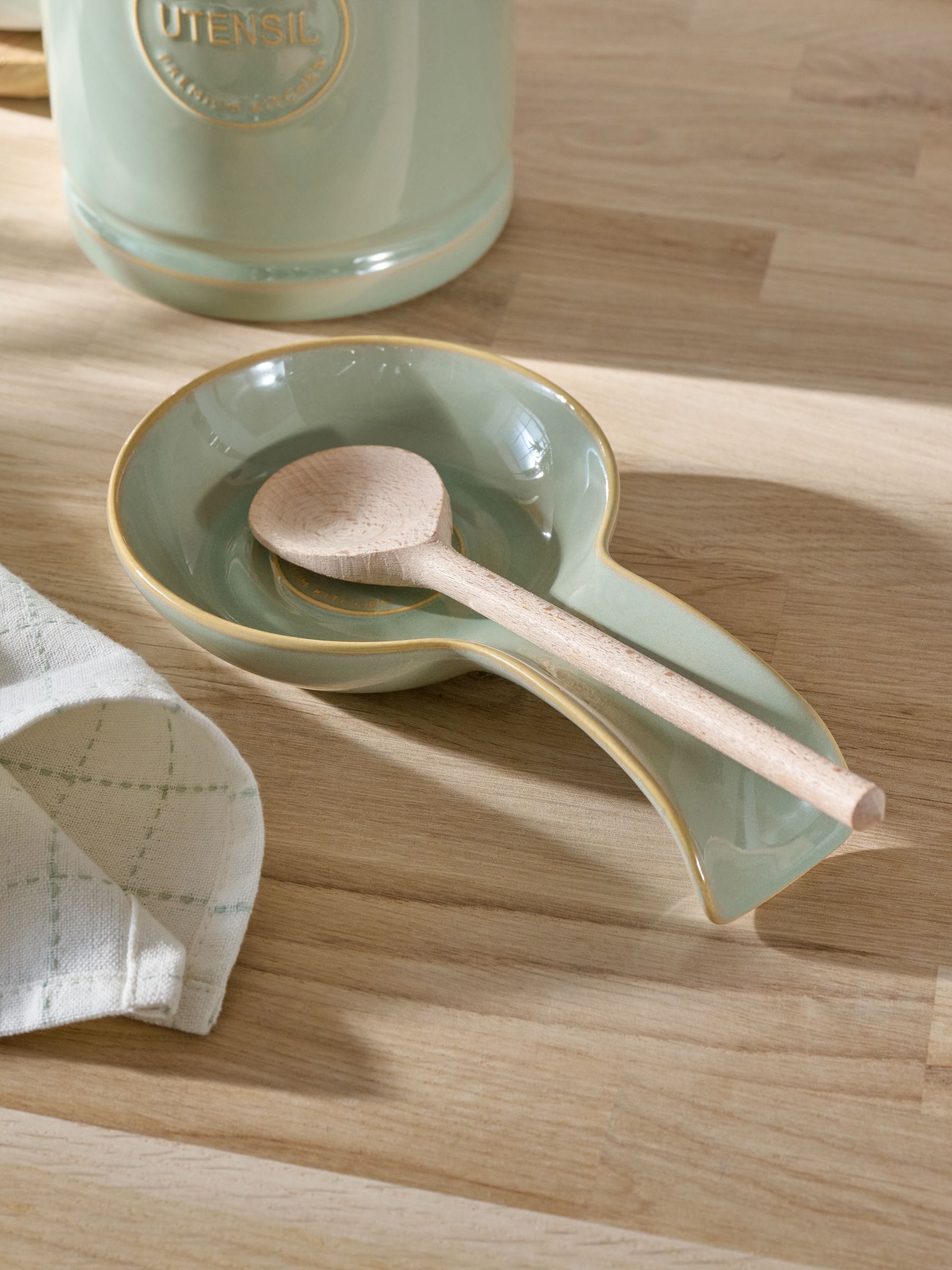 Stone finish spoon rest with embossed badge design. Keep your worktops clean whilst you cook. Coordinating storage jars available.