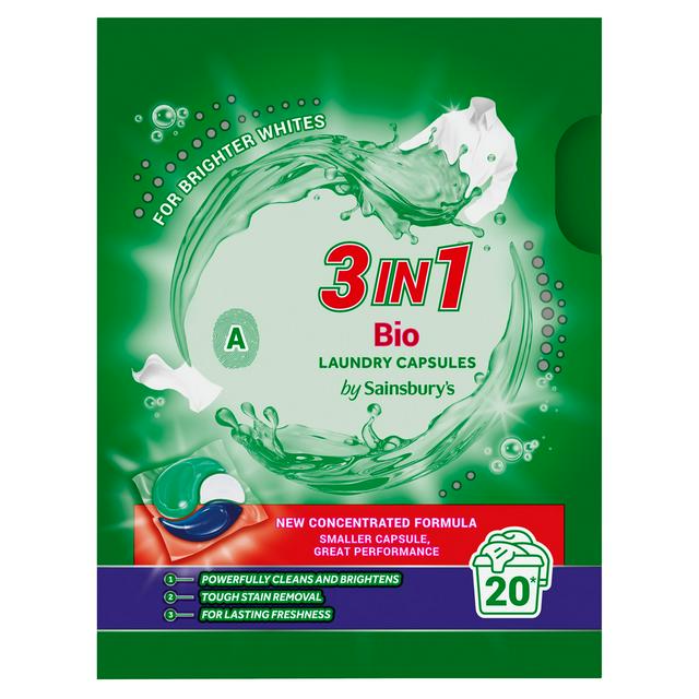 Sainsbury's 3in1 Bio liquid laundry capsules are formulated for comprehensive garment care. These convenient capsules deliver powerful cleaning and brightening action to your laundry loads. They are designed to tackle tough stains effectively while imparting a lasting freshness to your fabrics.