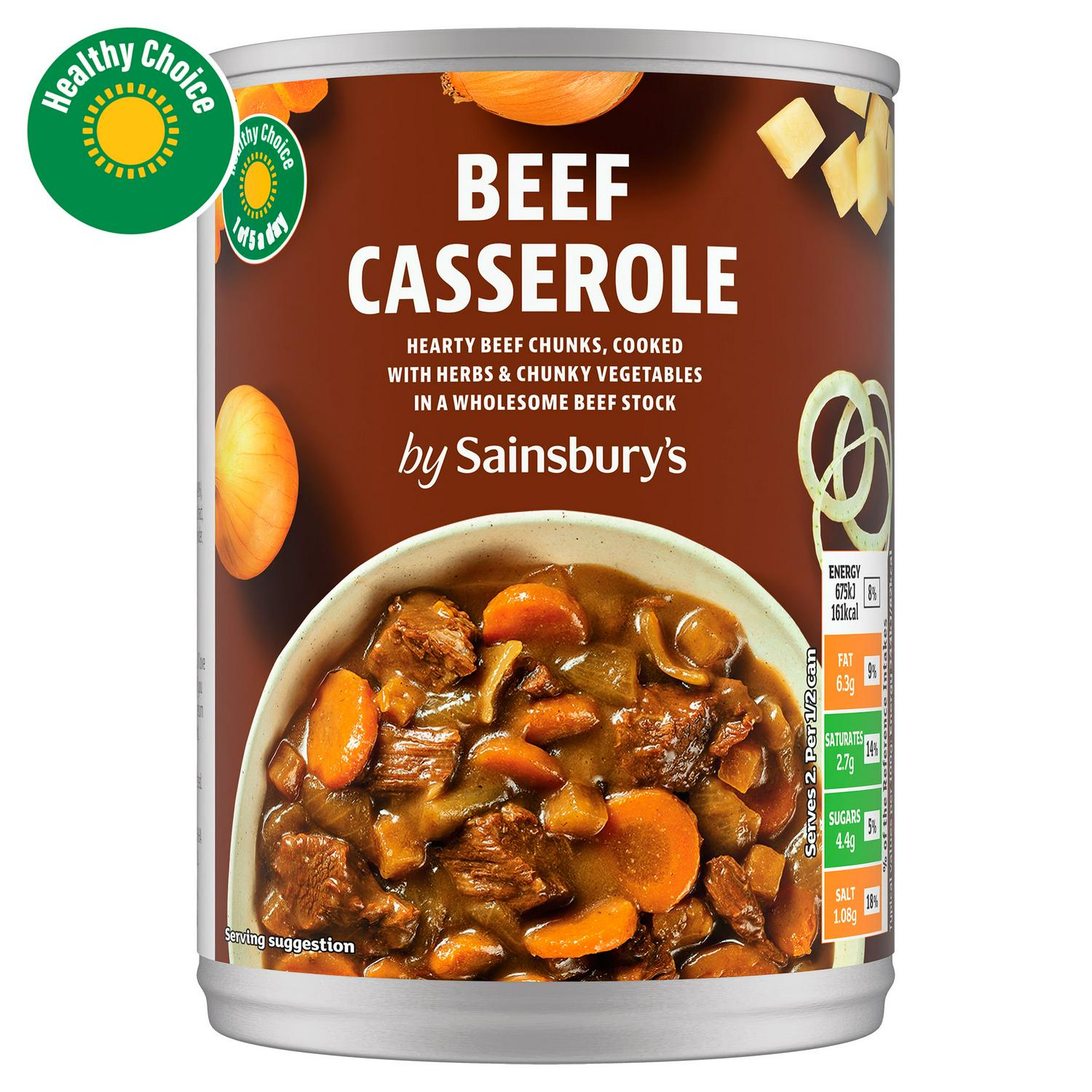 This Sainsbury's Beef Casserole delivers a satisfying and warming meal straight from the pack. It features tender pieces of beef combined with chunky vegetables in a flavourful base.