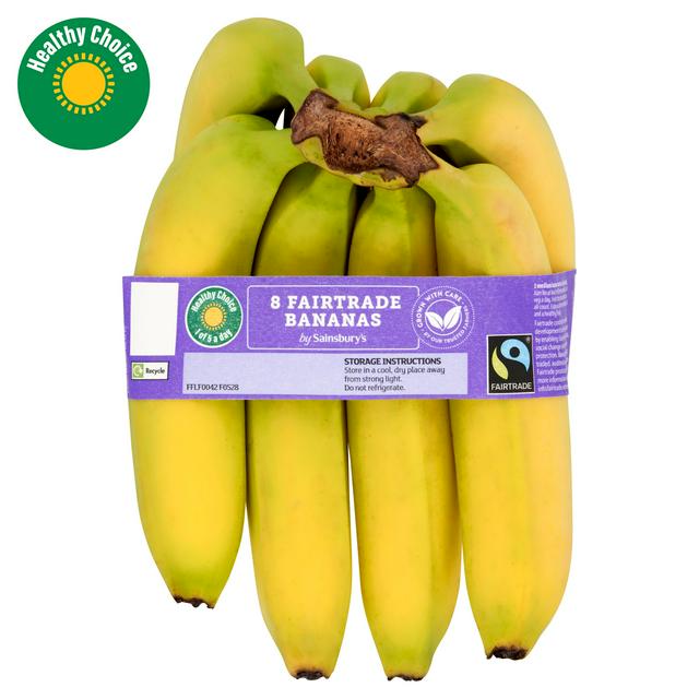 This pack contains eight Sainsbury's bananas, certified as Fairtrade produce for ethical sourcing. Enjoy this staple fruit as a convenient, naturally sweet snack or part of your breakfast routine. This larger pack size is suitable for family needs or ensuring a steady supply of fresh Fairtrade fruit.