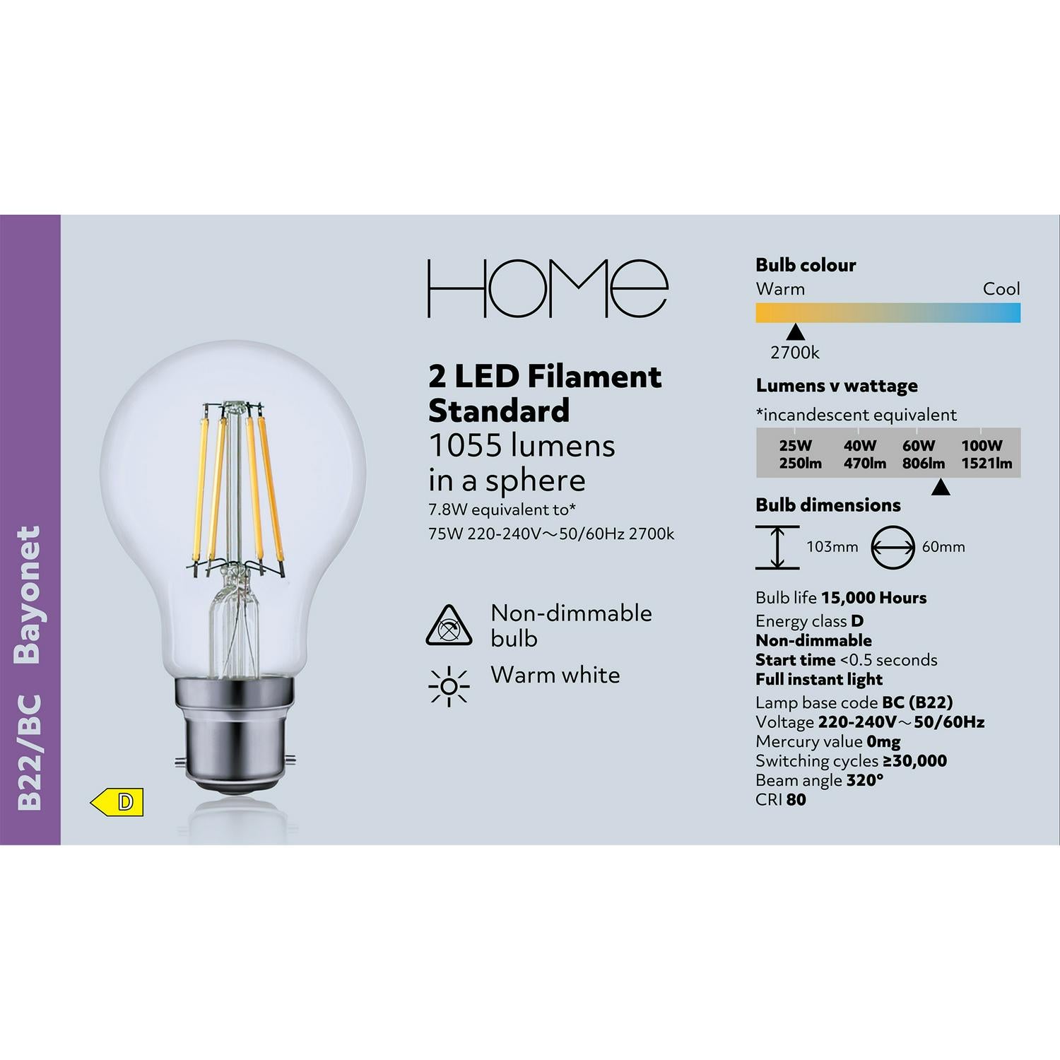 This twin pack of Sainsbury's Home LED filament bulbs delivers an instant warm light, perfect for standard room illumination. These D-rated bulbs operate efficiently at 7.8 watts, significantly reducing running costs when replacing older incandescent types.