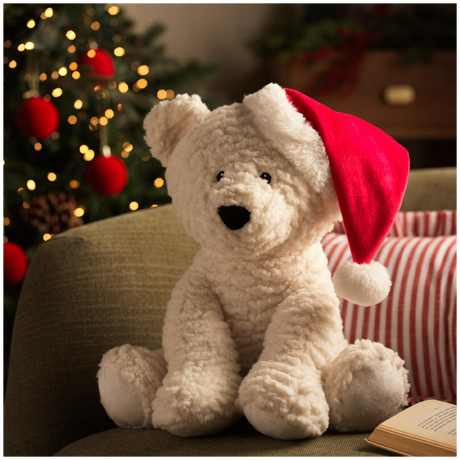 This charming Sainsbury's Home Polar Bear arrives dressed in a Santa hat for festive celebration. This irresistibly cute companion is made from soft material, making it a snuggle buddy for anyone in the family. It is suitable for gifting to newborn babies through to adults.