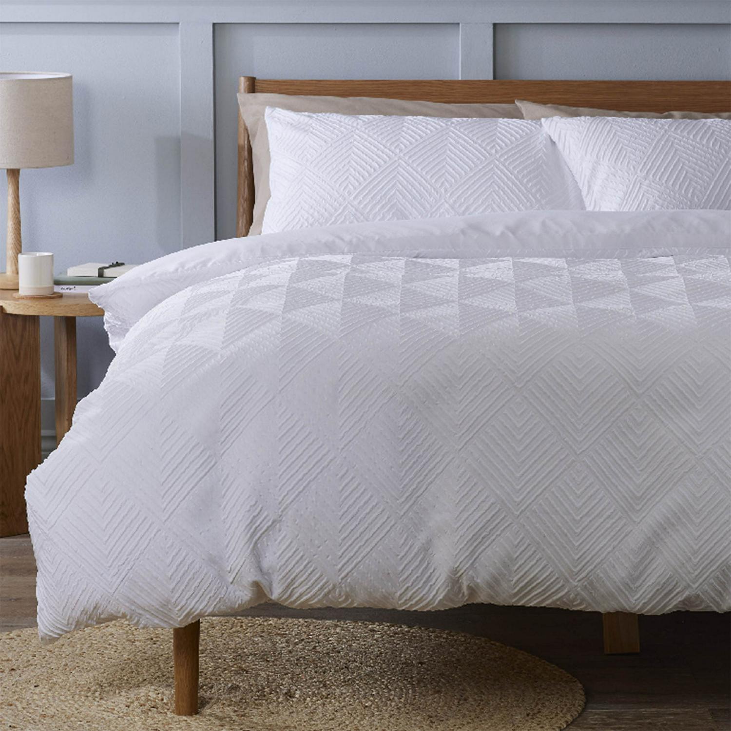 This Sainsbury's white bedding set features a contemporary chevron style, bringing a fresh and bright look to any bedroom space. Inspired by country homes and rural retreats, this collection offers a clean aesthetic combined with practical features. The bedding is finished with a heat set treatment, designed for convenience.