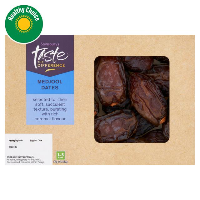 Product details Description Medjool dates selected for their soft, succulent texture, bursting with rich caramel flavour Safety Information Nutrition Table of Nutritional Information Typical values (as sold) per 100g per 30g % based on RI for Average Adult Energy 901kJ 271kJ 3% 213kcal 64kcal 3% Fat 0.5g <0.5g <1% Saturates... Read More