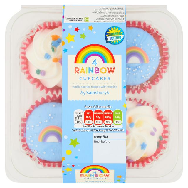 This pack provides four individual vanilla sponge cakes suitable for a small treat or celebration. Two distinct decorations are included across the set. Two cakes feature blue frosting and a sugar paste decoration, while the other two include mixed colourful sprinkles for contrast. These ready-to-eat baked goods offer convenient indulgence for any gathering.