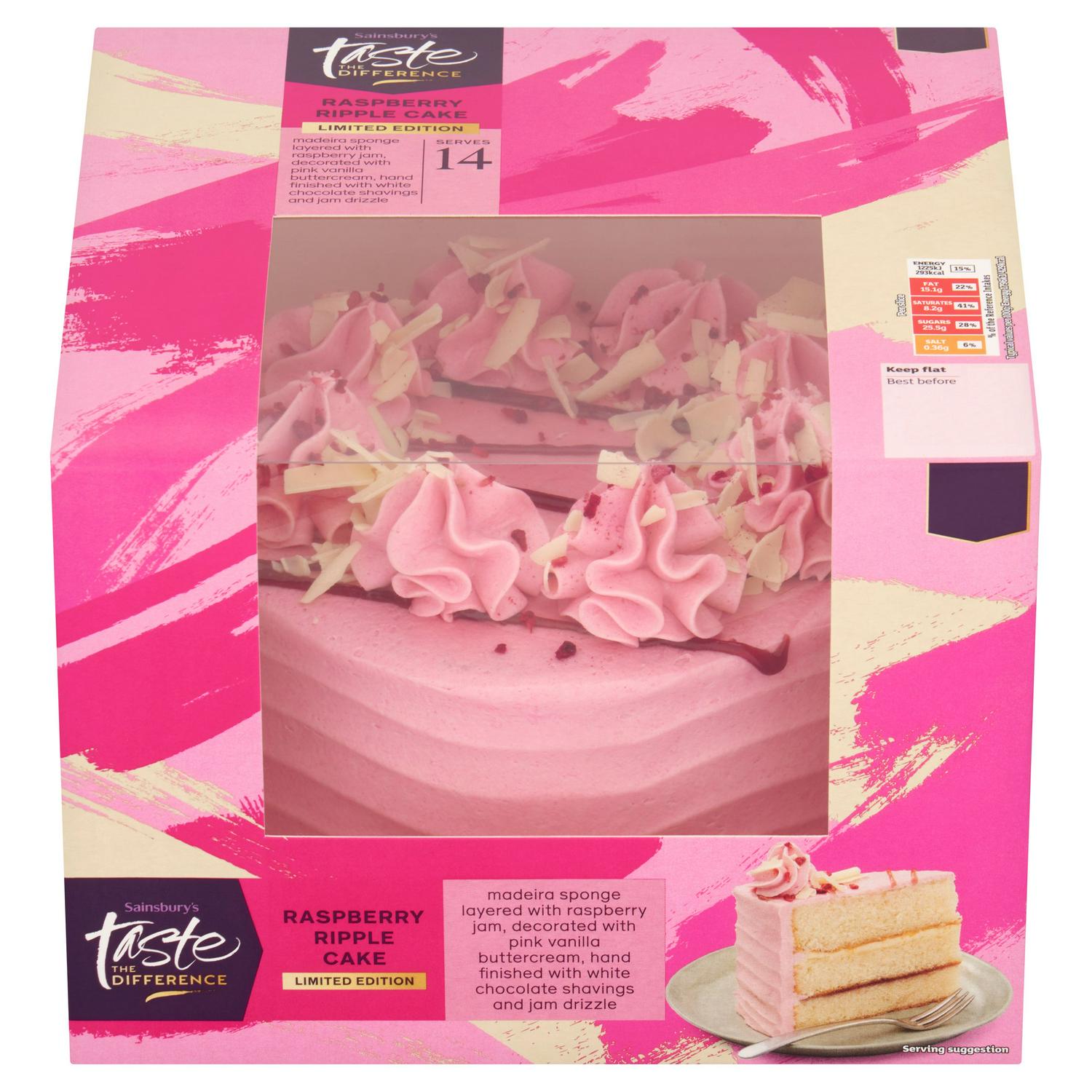 This limited edition Sainsbury's Taste the Difference cake features distinct layers perfect for any celebration. It is built upon a base of classic Madeira sponge which is layered with sweet raspberry jam and smooth vanilla flavour buttercream. This visually appealing dessert offers rich texture and fruit flavour contrasts.