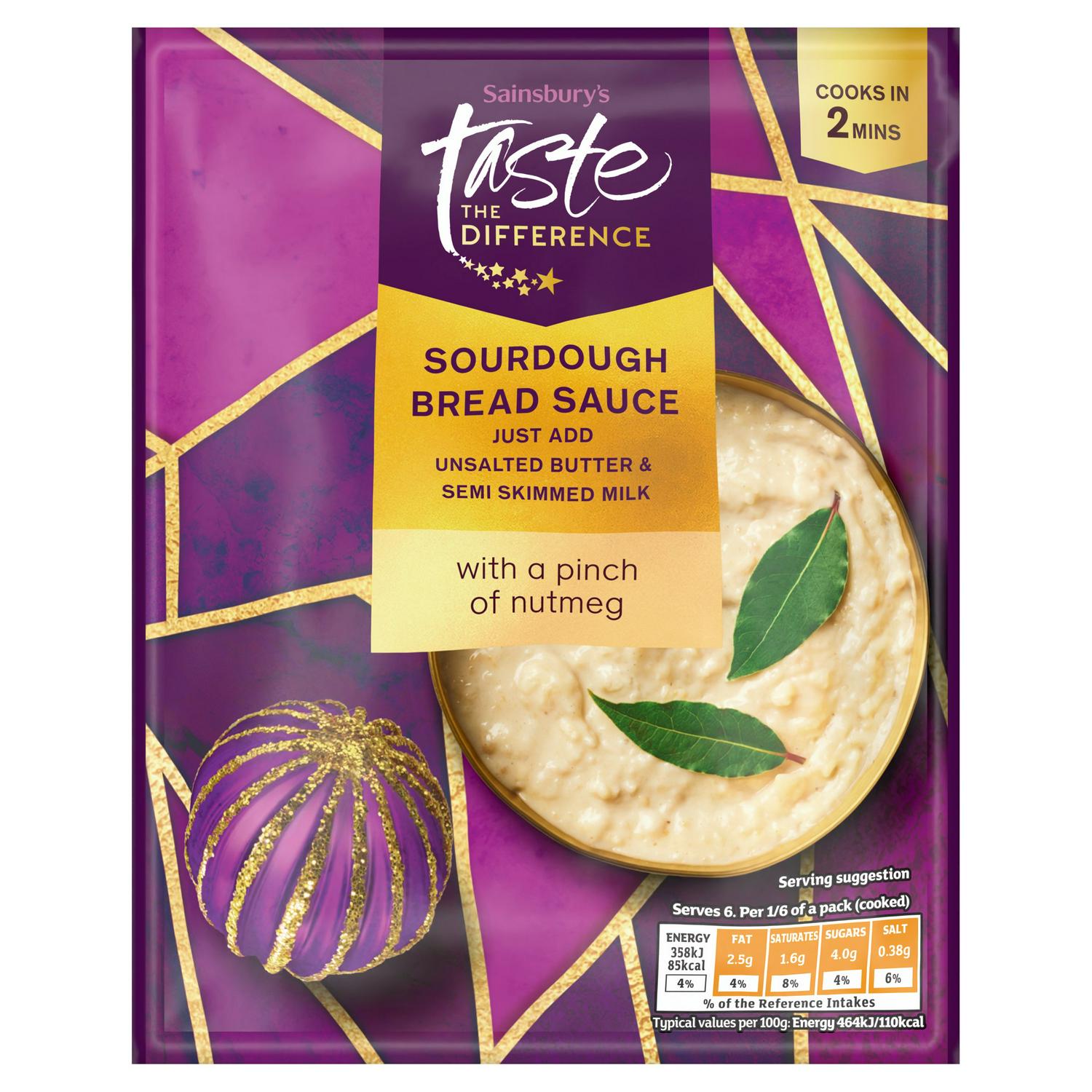 Elevate your meals with this Sainsbury's Taste the Difference bread sauce mix. It features a premium recipe using breadcrumbs derived from sourdough. This mix is fragrantly spiced with traditional seasonings, including nutmeg, clove, and onion.