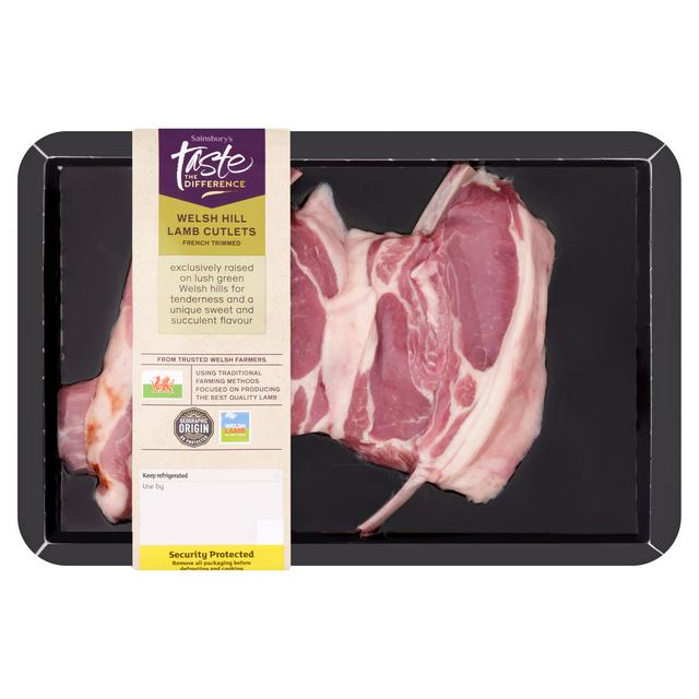 Sainsbury's Taste the Difference Welsh Hill Lamb Cutlets present four French trimmed portions, 265g total, ideal for sharing meals. These premium cuts are exclusively raised on lush green Welsh pastures, guaranteeing a truly succulent eating experience every time for your family. Enjoy this quality meat.