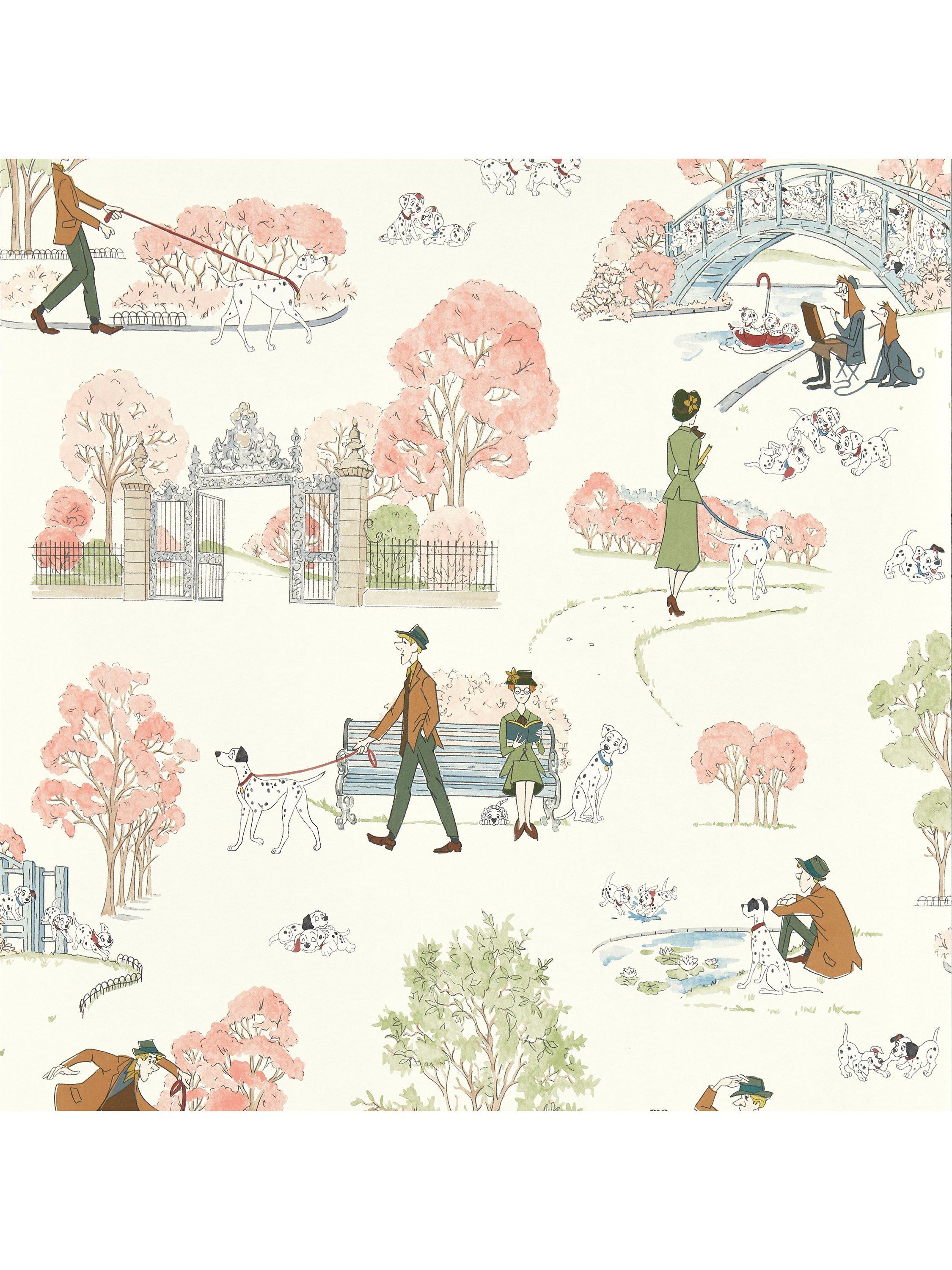 This wallpaper beautifully interprets the storyline of Disney`s 101 Dalmatians film. A time-honoured favourite with a playful vintage feel the design combines elements from archival Sanderson documents alongside scenes from the original movie.
