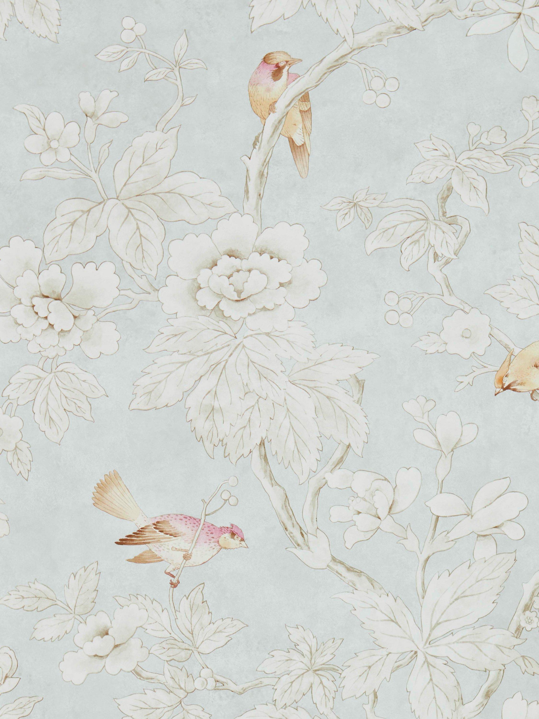 An exquisite chinoiserie, inspired by an original document from the Sanderson archive designed by William Turner* c.1910. This unusual tree pattern has been repainted in a looser watery handwriting to update it and allow the birds to pop out against a textured softened ground.