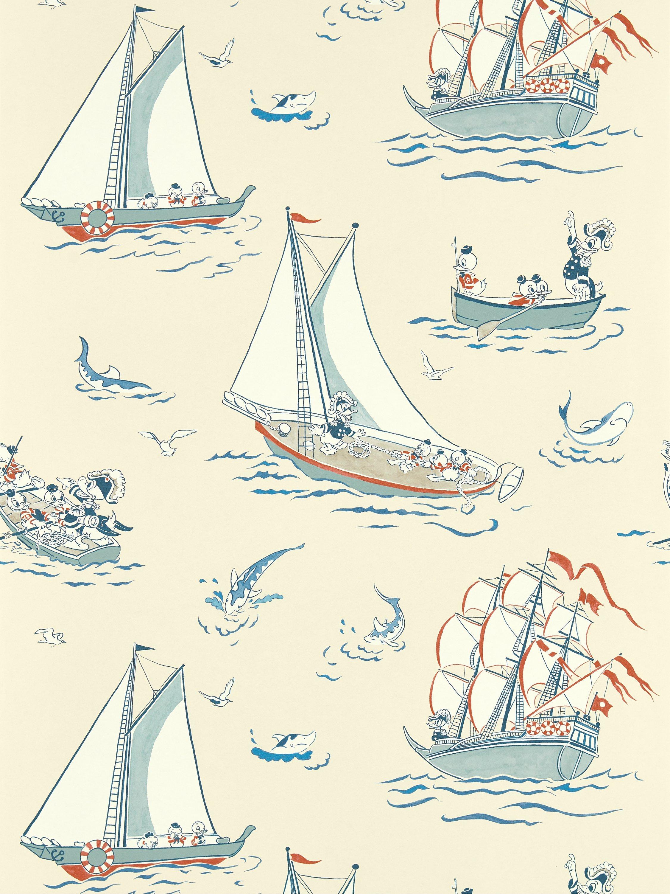 Sanderson presents this delightful nautical wallpaper featuring Donald Duck and his nephews, Huey, Dewey, and Louie, on a grand voyage. This design draws directly from original Disney style guides and animation stills for authenticity. Hand-painted boats, sharks, and seagulls enhance this whimsical, seafaring theme suitable for any child’s room.