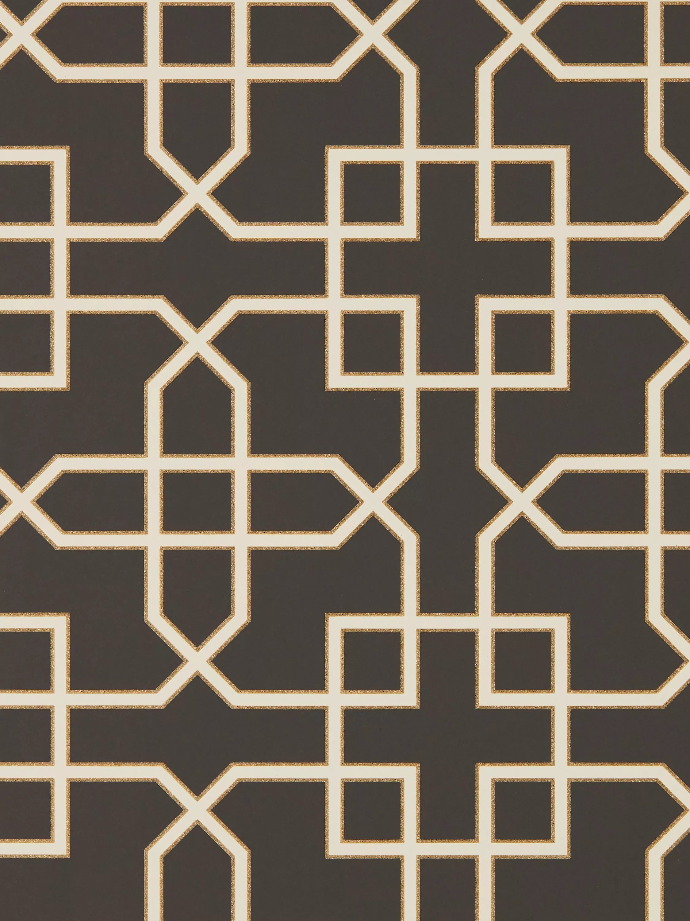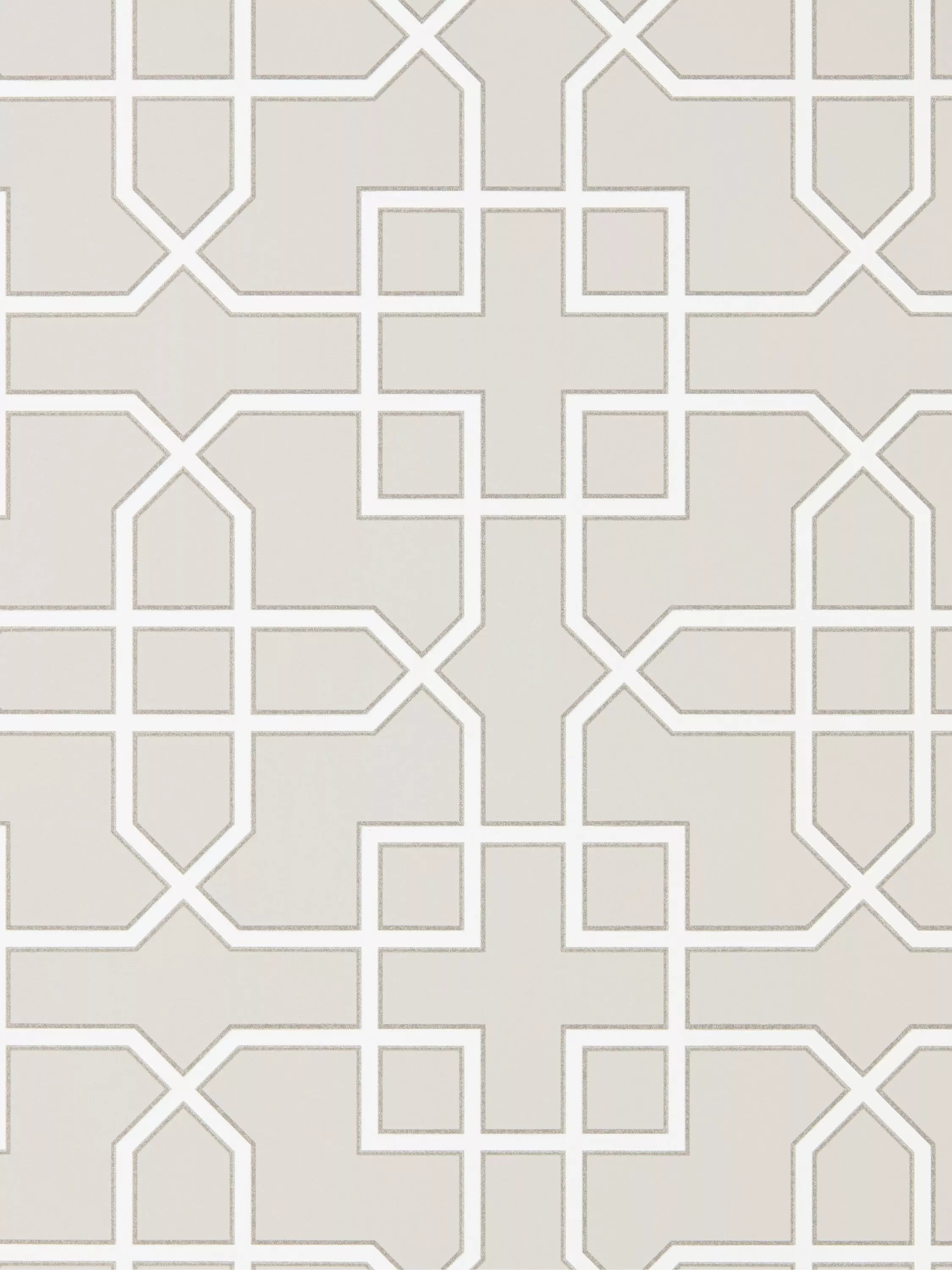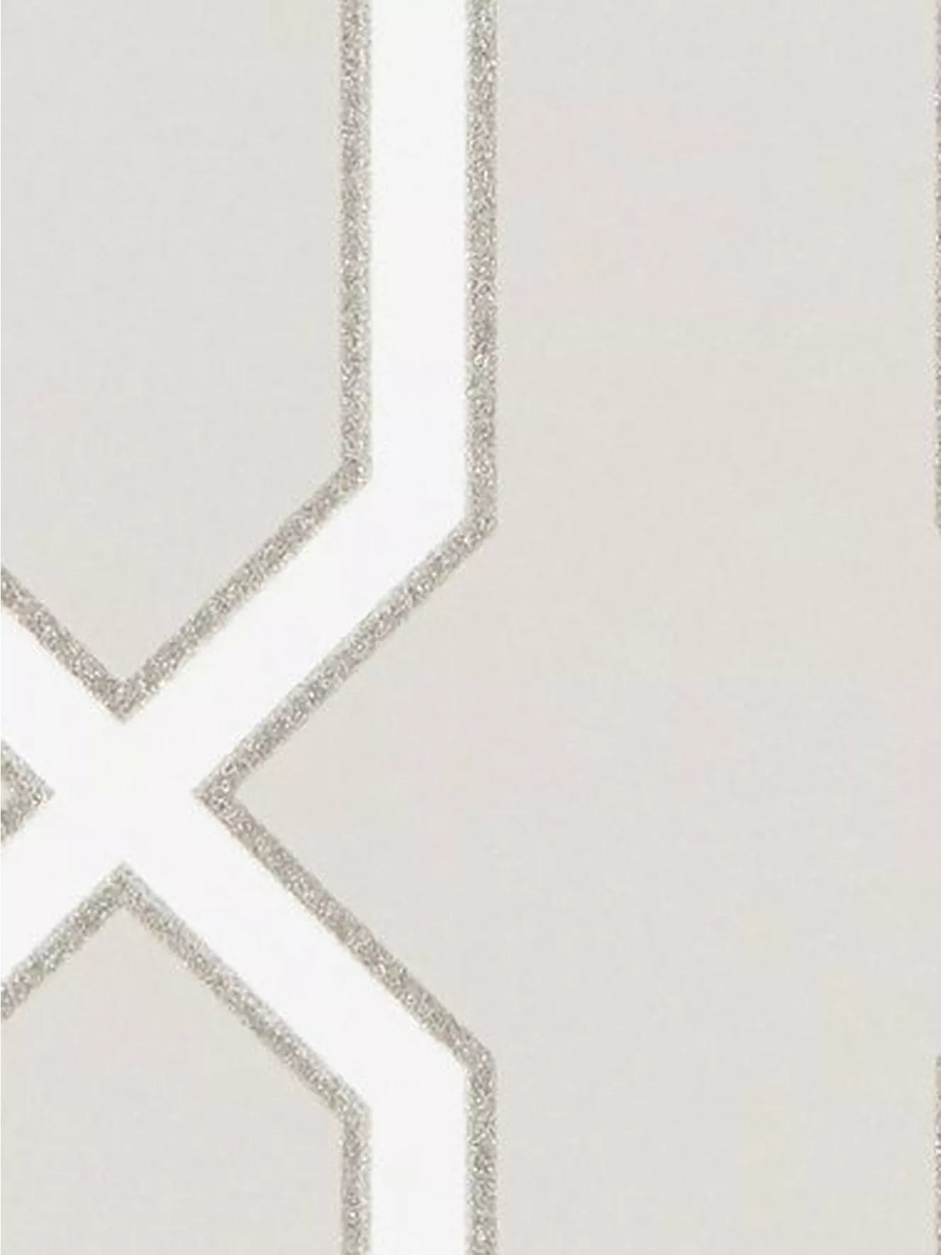 This smart, structural geometric pattern has been printed to provide a chalky opaque ground against the metallic and glitter detailing of the trellis design.
