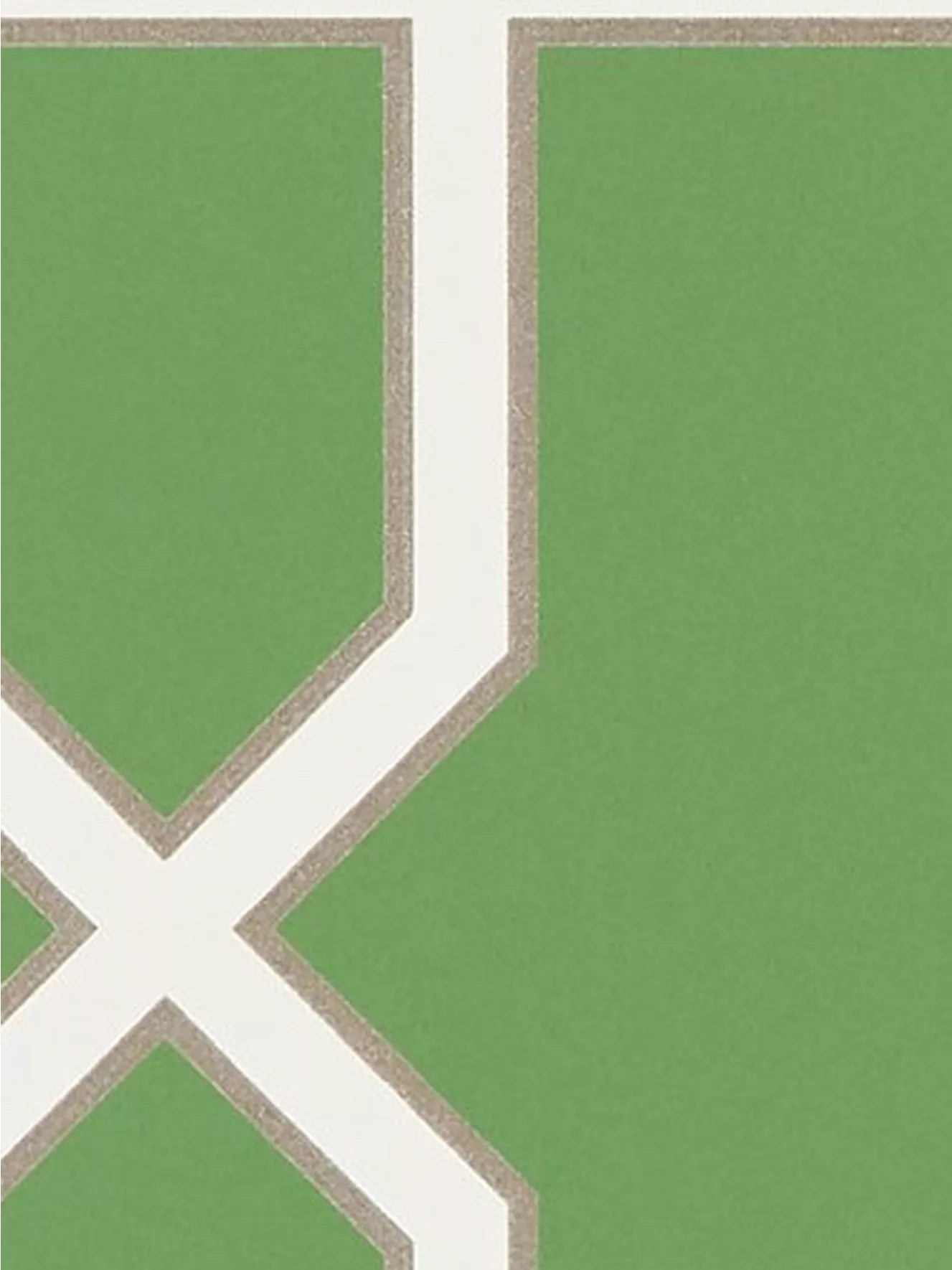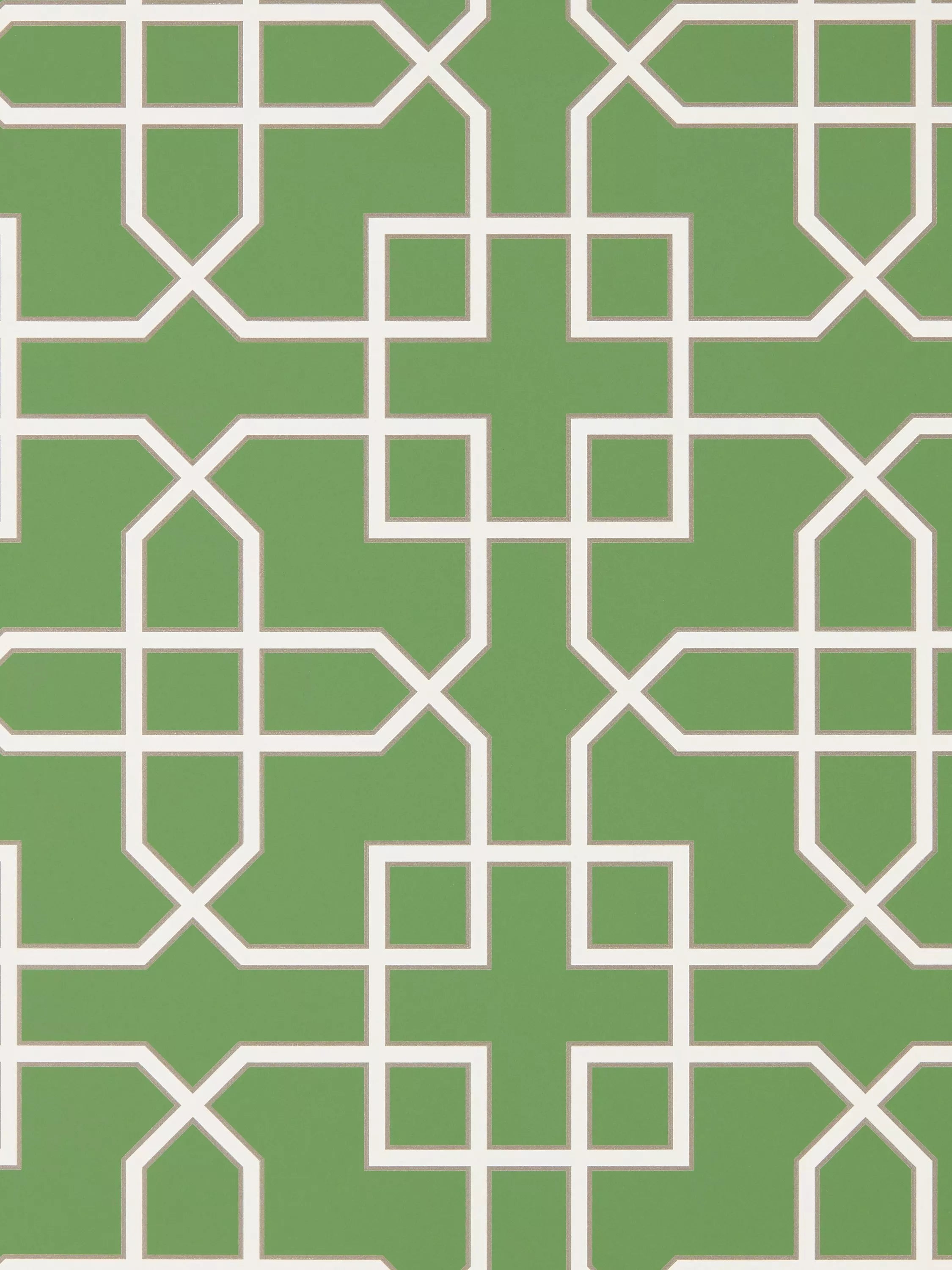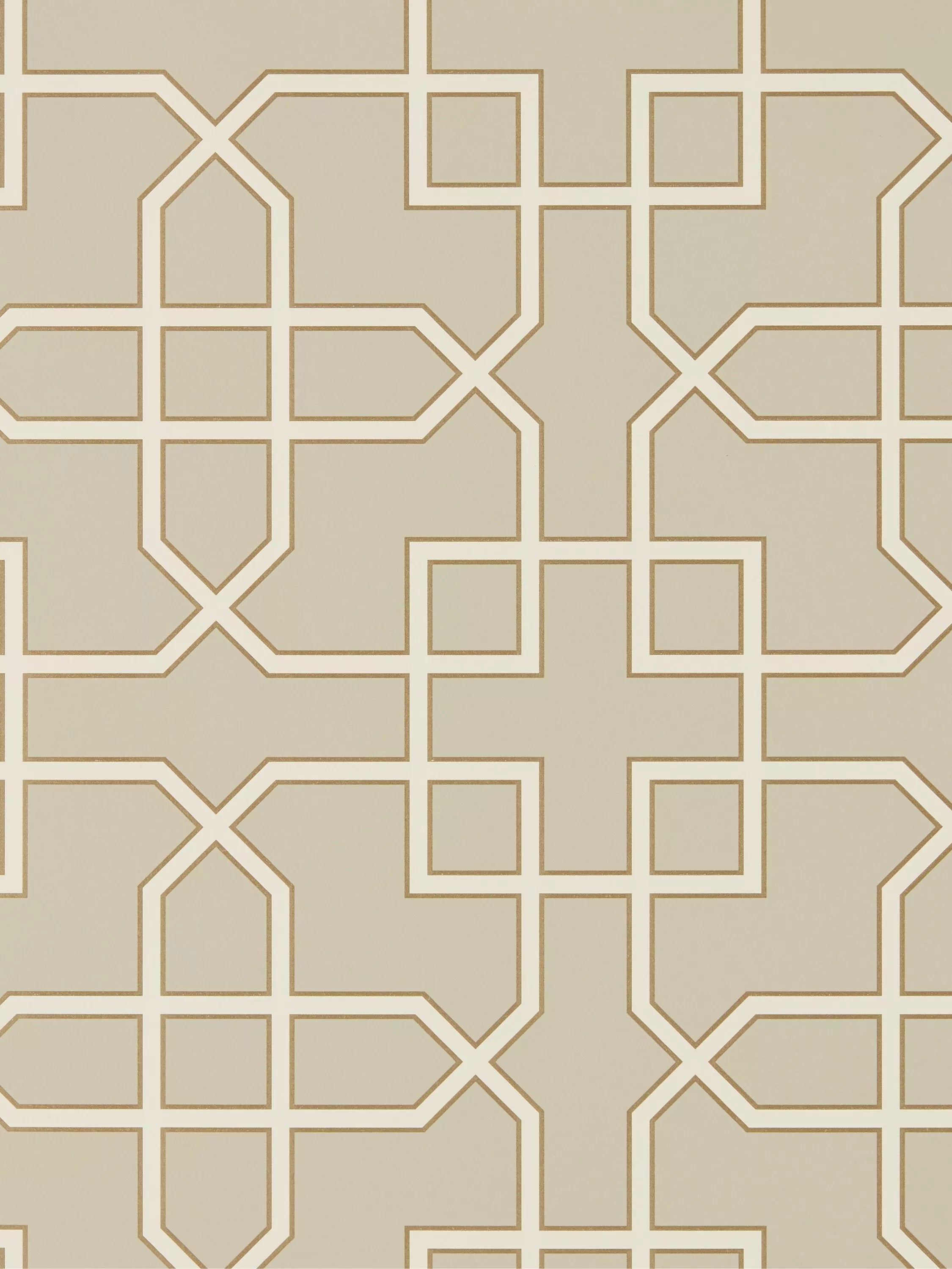 This smart, structural geometric pattern has been printed to provide a chalky opaque ground against the metallic and glitter detailing of the trellis design.