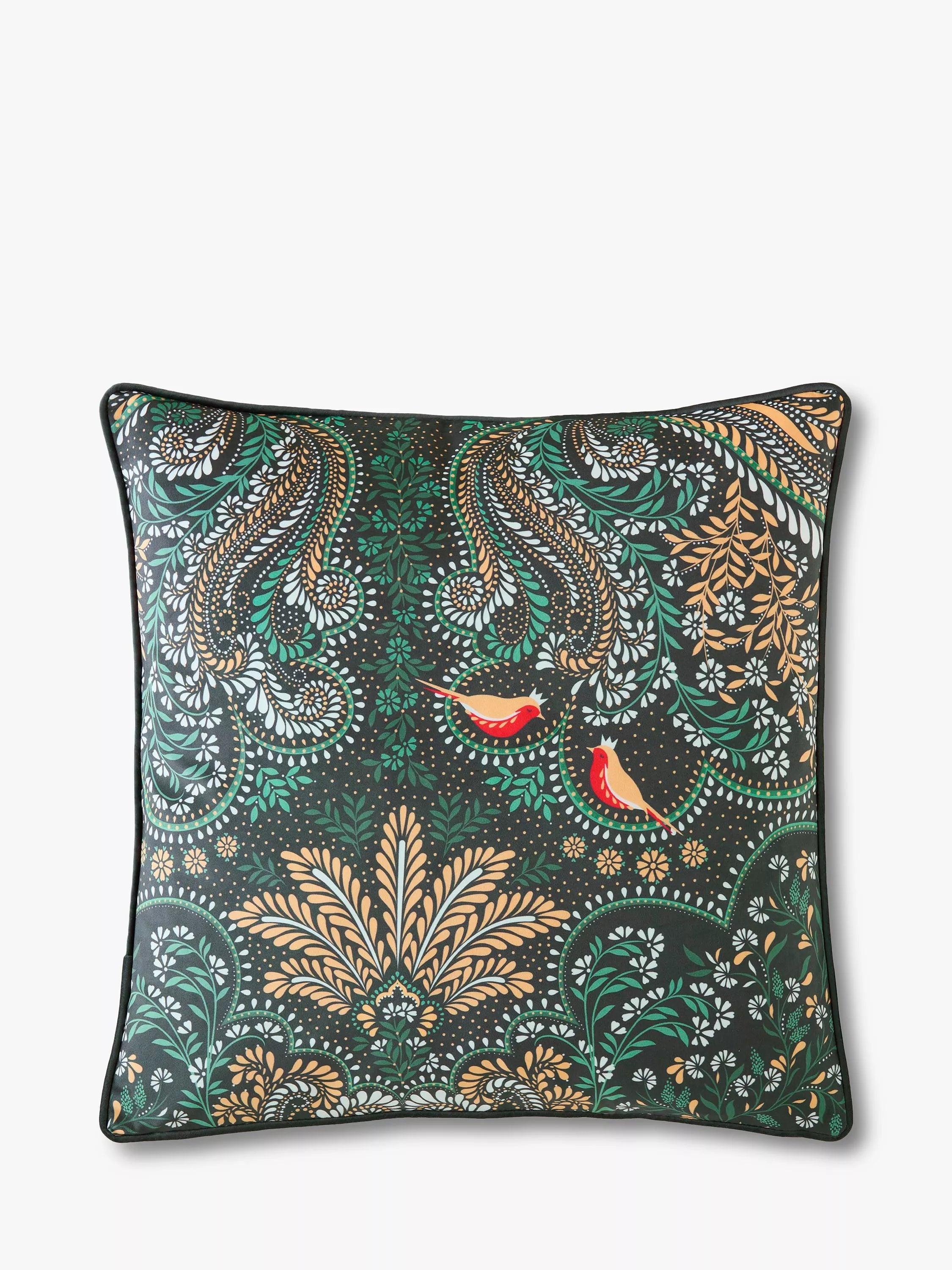 A sumptuous soft velvet cushion featuring a kaleidoscopic feast of flowing pattern, scrolling ferns and intricate little leaves in deep emerald green.