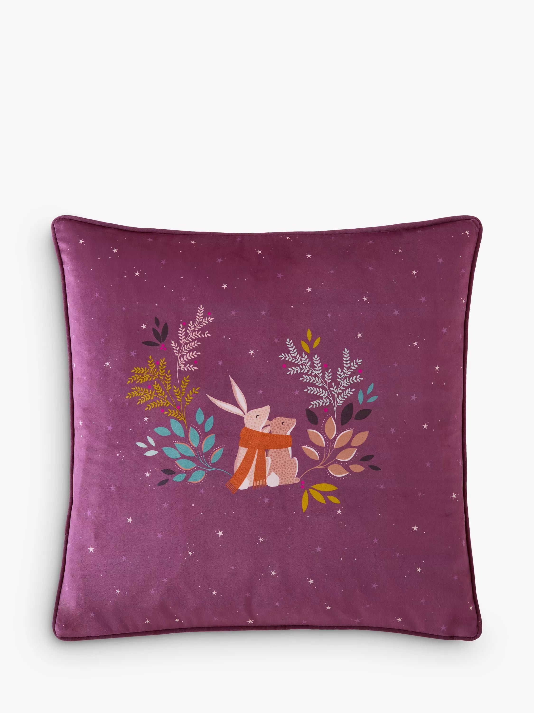 Add festive charm to your sofa or bed with this Woodland Tales Cosy Rabbits velvet cushion from Sara Miller London.