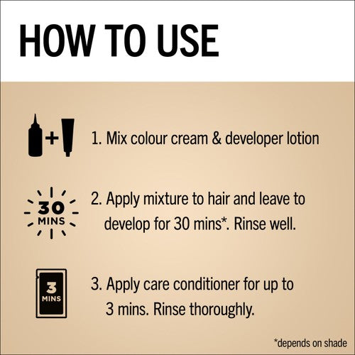 Read More100 % Grey Coverage, Ammonia Free Schwarzkopf's permanent oil colouration technology infuses the colour pigments deeply into the hair fibre, for a rich and long-lasting colour. Strong & Healthy-Looking Hair The rich oil mask contains 4 caring oils providing the ultimate nourishment after colouration to restore strength for healthy-looking hair. Leaves the hair soft, silky and shiny. Up to 90% less hair breakage* The Rich Oil Mask with Schwarzkopf's bonding technology HaptIQ System intensively cares for the hair by: 1. Creating new micro-bonds within the hair 2. Enveloping the hair with a protective layer 3. Restoring strength for up to 90% less hair breakage* HaptIQ - Beautiful hair results you can feel. * Instrumental test with and without mask The highlighted colour result shows the model's hair colour on the front. The colour result depends on your natural hair colour. This shade is suitable for all hair textures and for up to 100% grey hair. Lasts permanently. Mask with 95%** Ingredients from the nature **including water