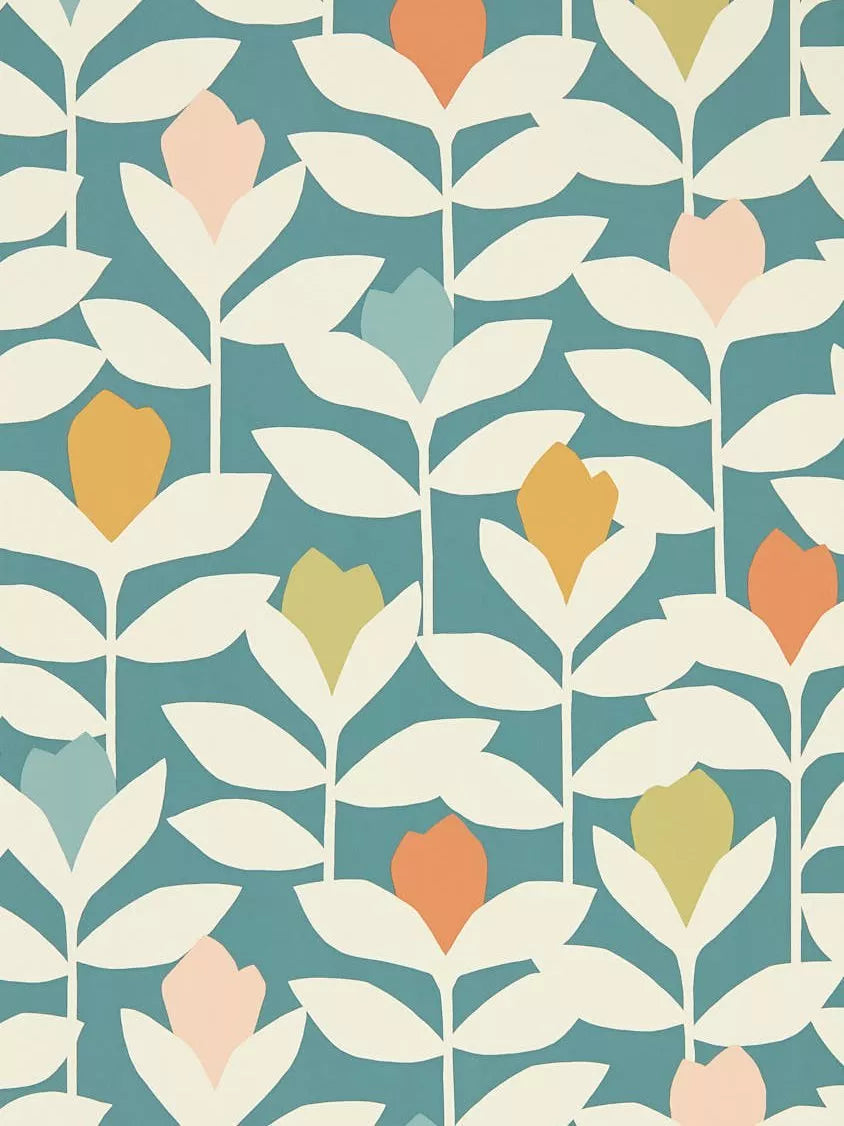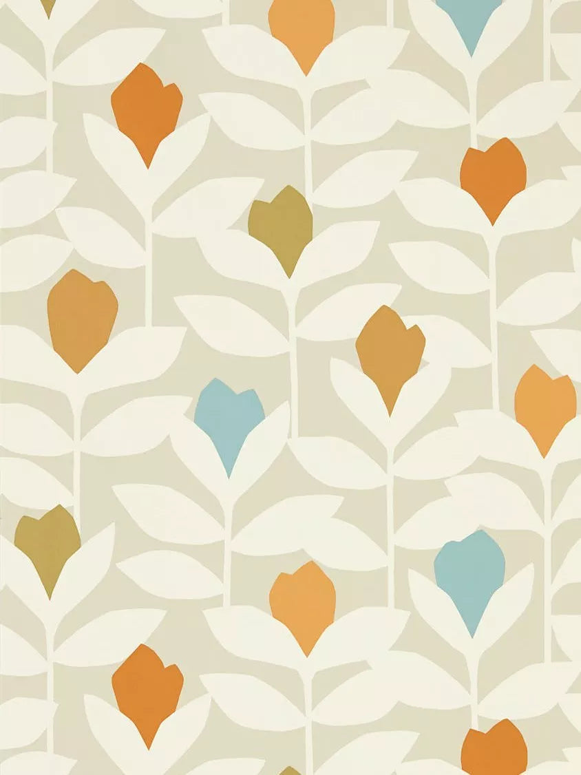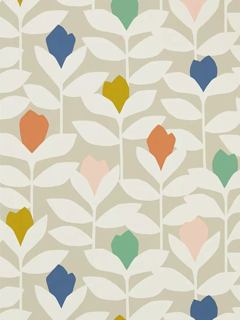 Confident pops of colour stand out amid layers of stylised stems on this classic Scion wallpaper.