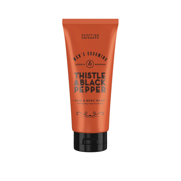Contains 200ml Cleanse and refresh Scent: Thistle & Black Pepper Vegan friendly formulas Made in Scotland Step into the rugged beauty of the Scottish wild with the Thistle & Black Pepper Hair & Body Wash. Designed to cleanse and refresh, this all-in-one wash removes excess oils and impurities while hydrating your hair and skin. Enriched with milk thistle extract for purification and panthenol for deep moisture, it leaves you feeling revitalized and smooth. Finished with warm, bold notes of woody amber and pepper.