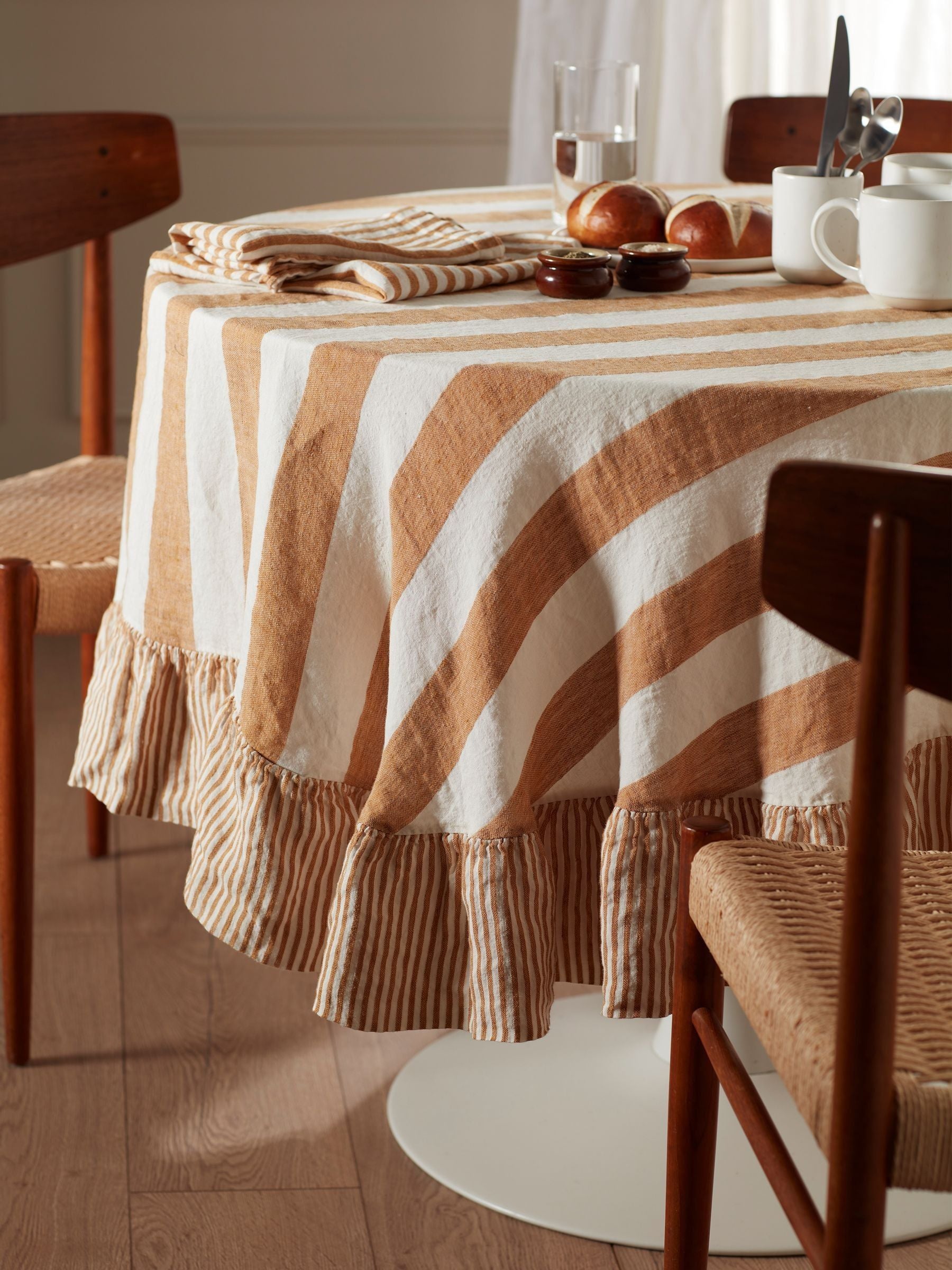 We’re in love with this playful and perfectly pretty striped tablecloth. Featuring woven stripes in off-white and warm amber, this 100% linen round tablecloth is finished with a glorious frill in contrasting narrower stripes. Pre-treat stains and wash at 30 degrees. Size: 180cm diameter. Made in Portugal.