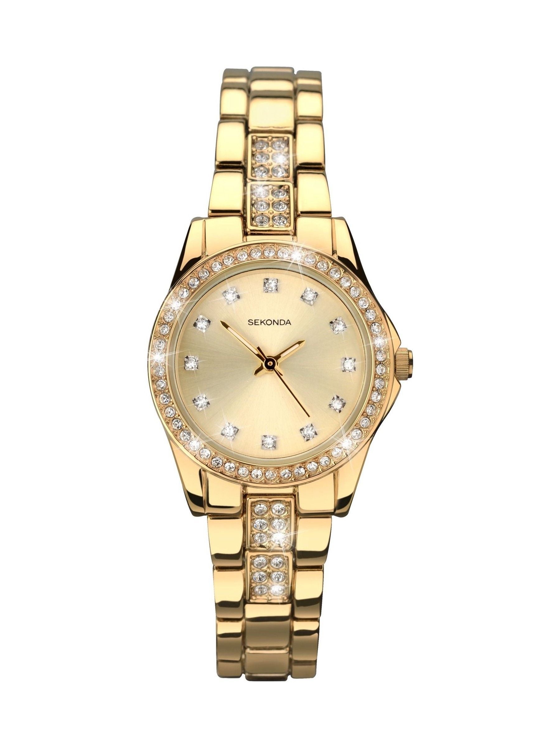 Sekonda ladies watch with a round gold plated stone set case, silver-coloured ionic plated case, champagne sunray dial set with clear crystals and gold plated stone set bracelet. Two-year guarantee.