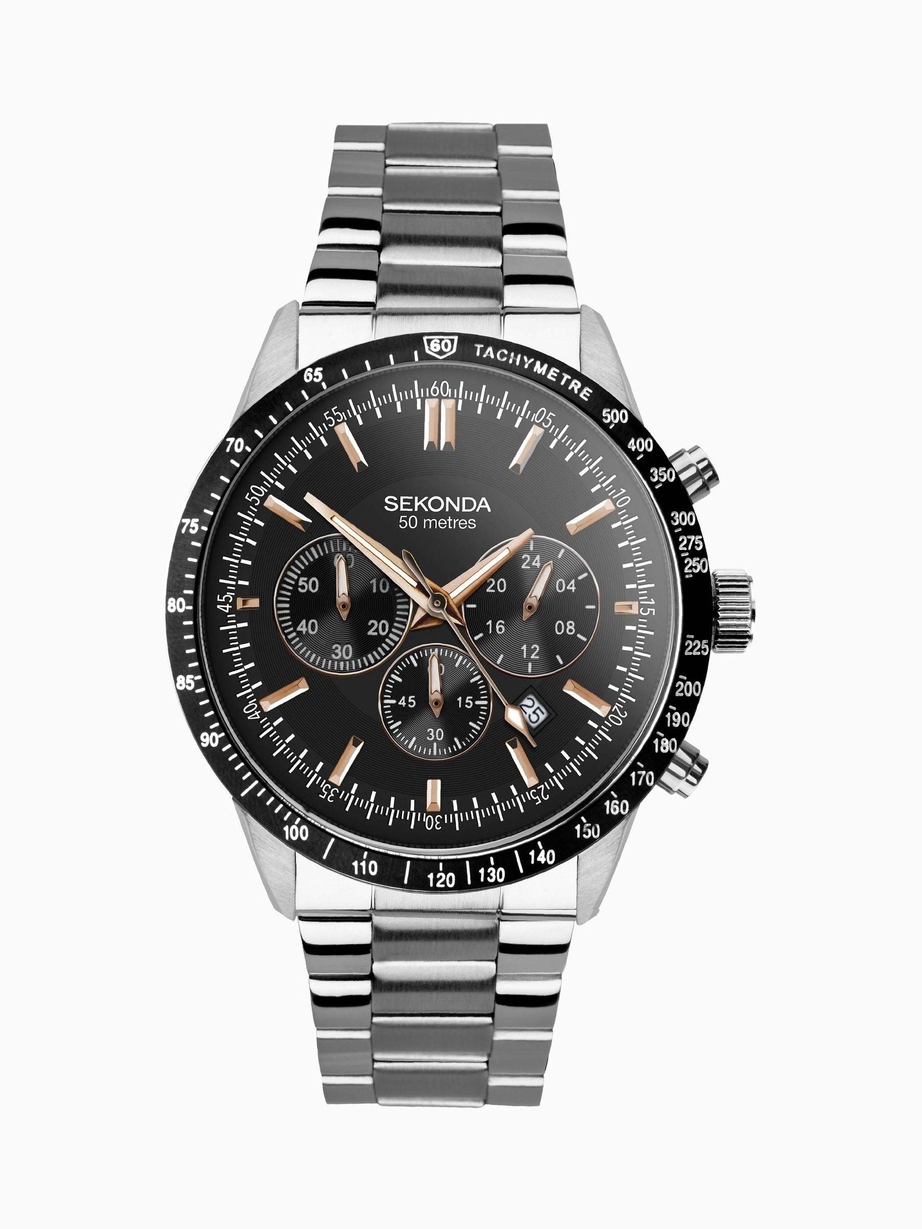 This men's chronograph sports watch fastens with a stainless steel bracelet. The watch has a round stainless steel case with a black bezel and tachymeter markings and a black dial. Features include one-second chronograph timing of up to one hour, 24-hour readout and water resistance of up to 50 metres.