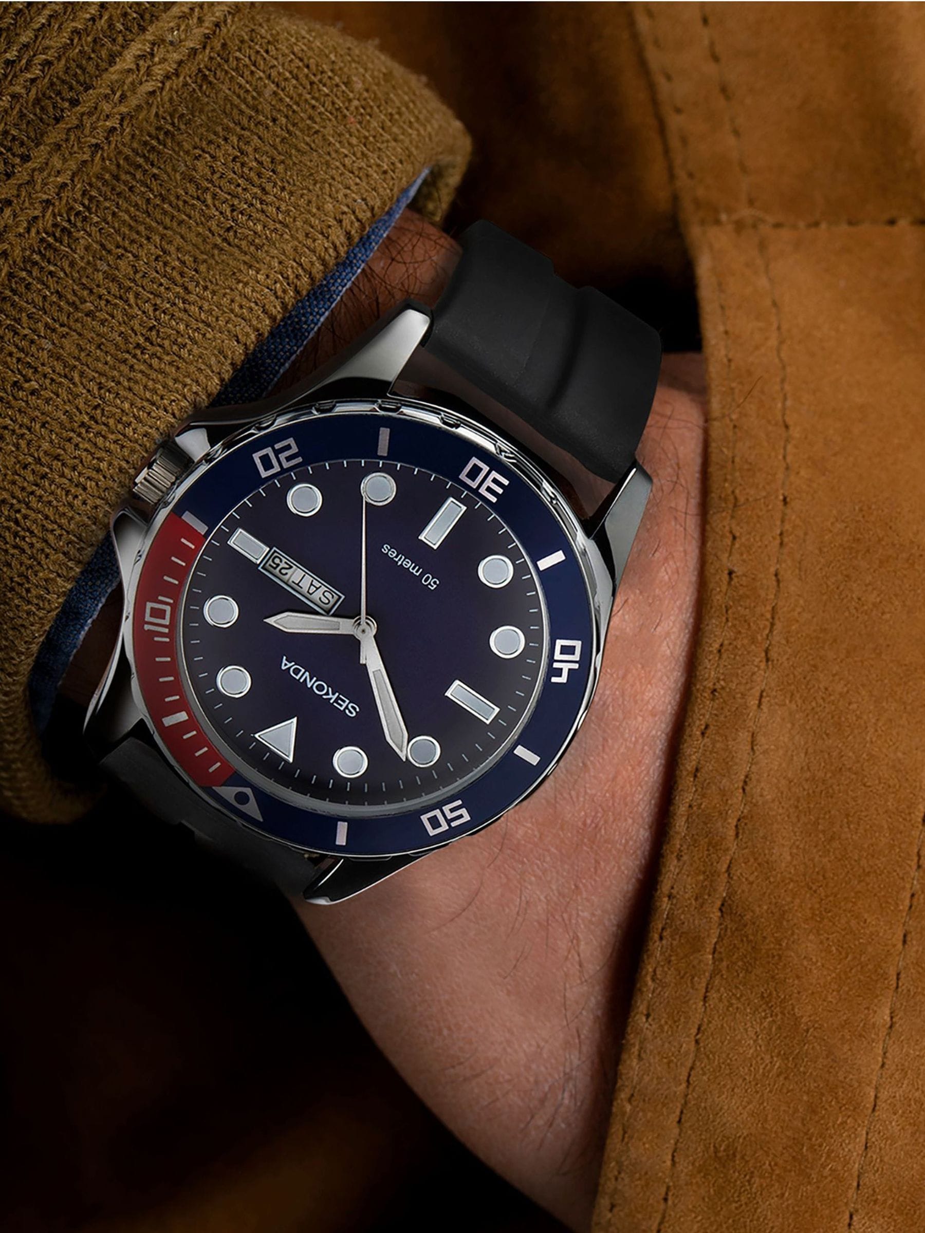 This watch fastens with a black rubber strap. The watch has a round silver coloured case with a blue and red bezel housing a blue matte dial with a day/date display. Finished with water resistance to 50 metres.