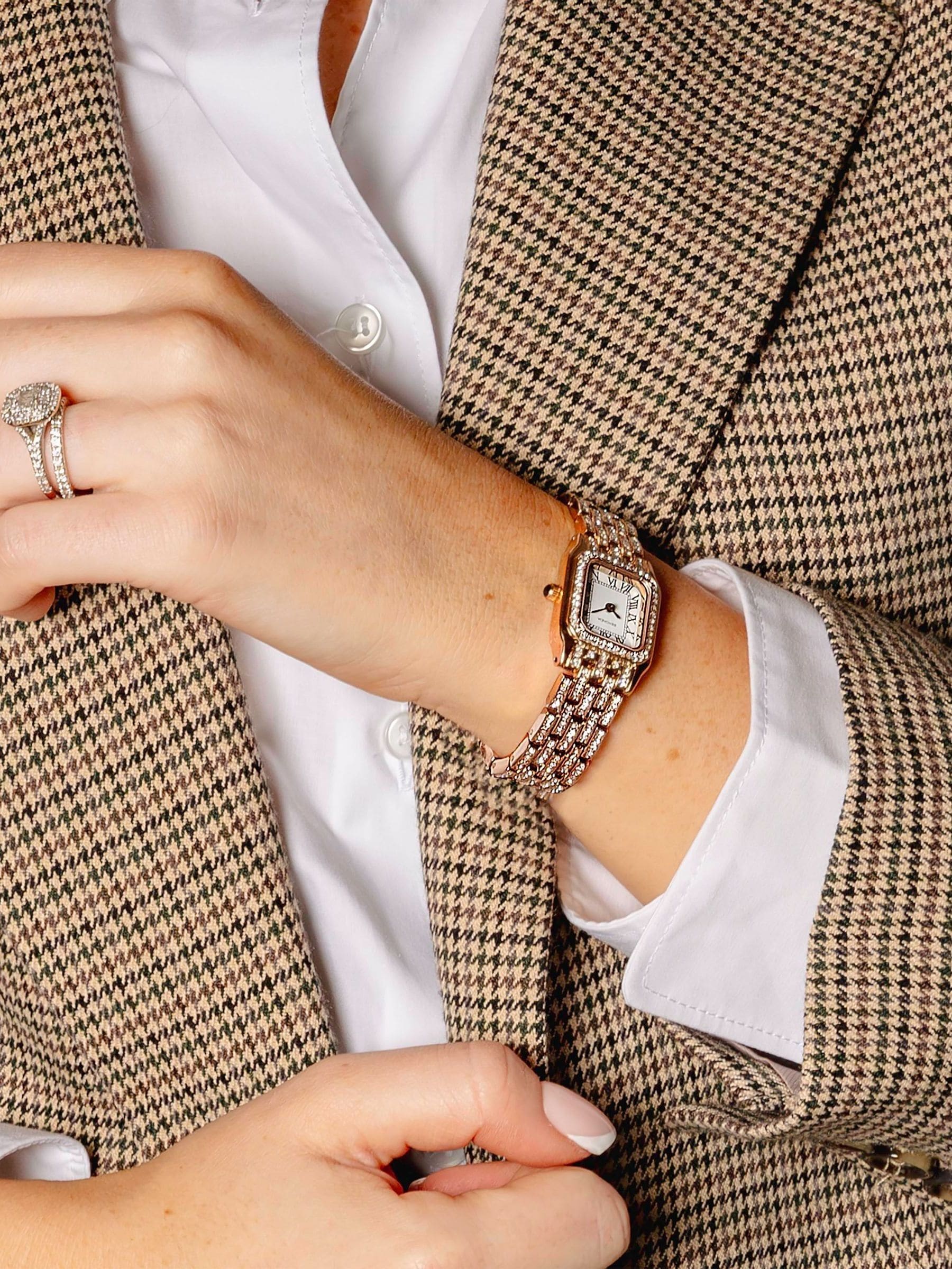 This watch fastens with a stone set, rose gold plated alloy bracelet. The watch has a stone set, rectangular rose gold plated alloy case housing a white dial.