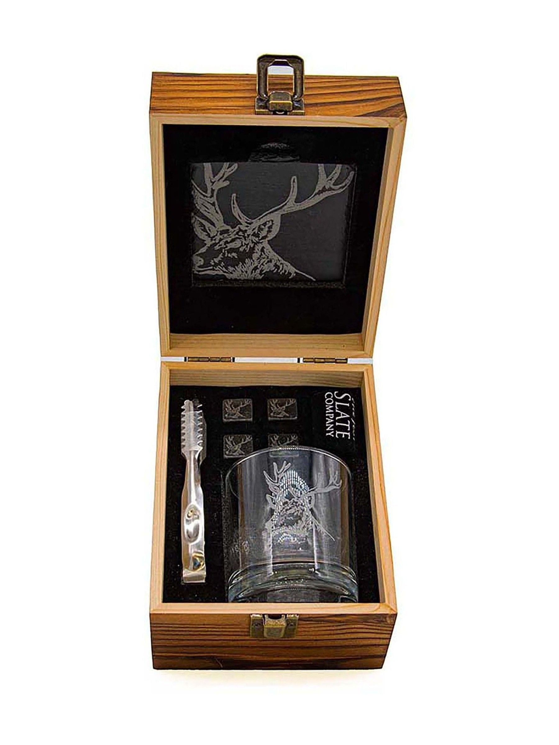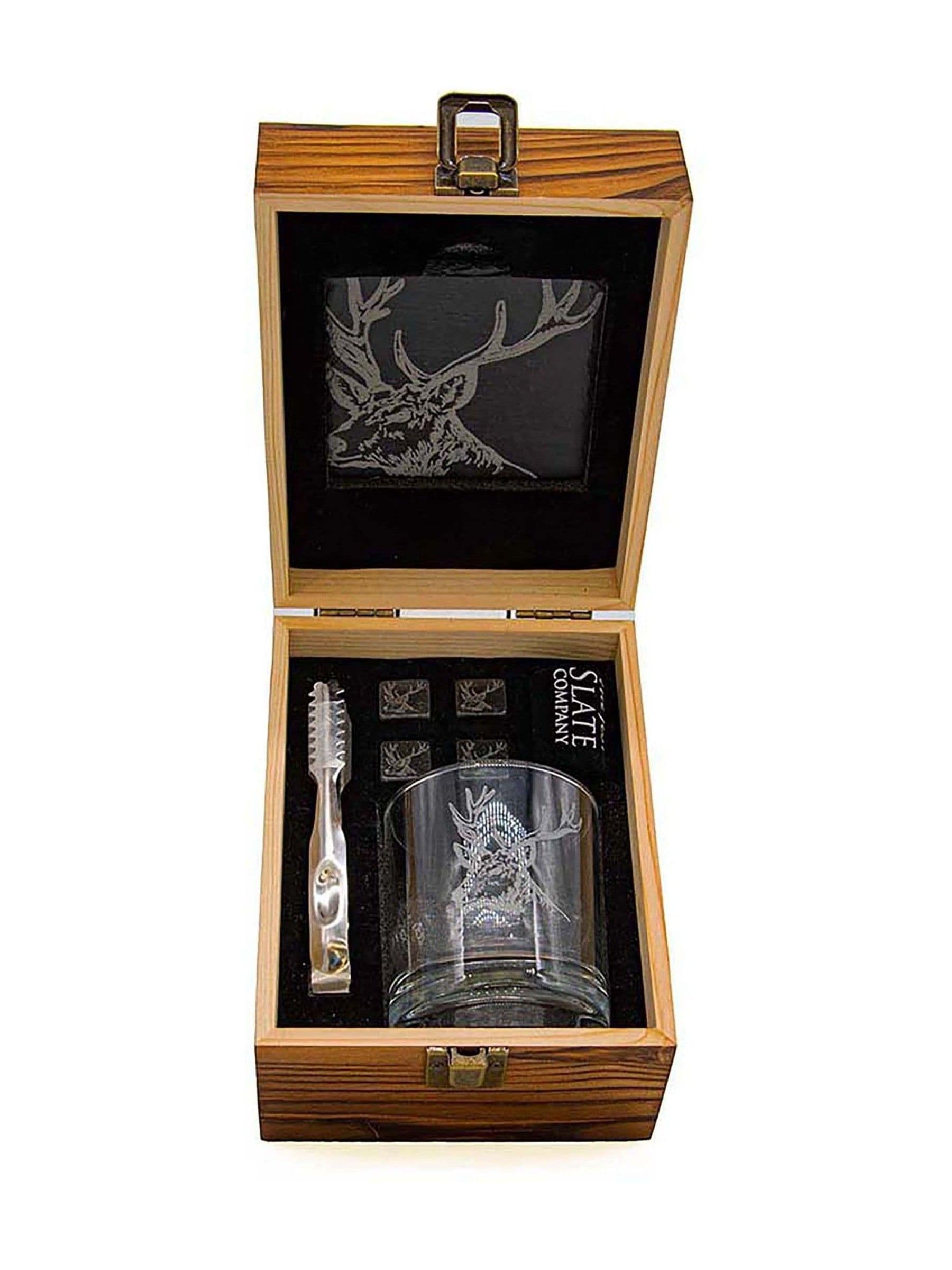 This set includes a stag prince printed whisky tumbler and engraved slate coaster alongside whisky stones, a velvet pouch and mini tongs, allowing you to cool your drink without diluting it. Complete with a gift box this set will make for a tasteful gift for those who enjoy a little tipple.